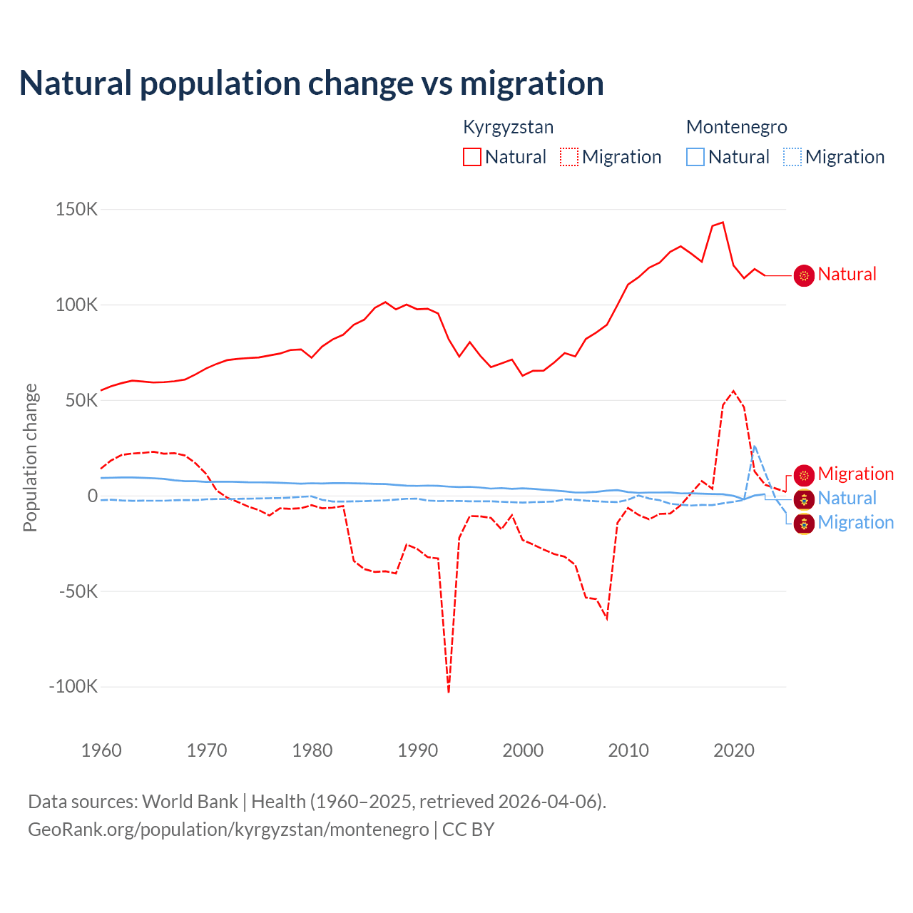 Over the last 10 years, 88.5% of the population change in Kyrgyzstan is from natural causes (a gain of 1,258,837 people) and 11.5% is from migration (a gain of 164,132 people). In Montenegro 52.4% is from natural causes (a gain of 4,501 people) and 47.6% is from migration (a gain of 4,095 people).