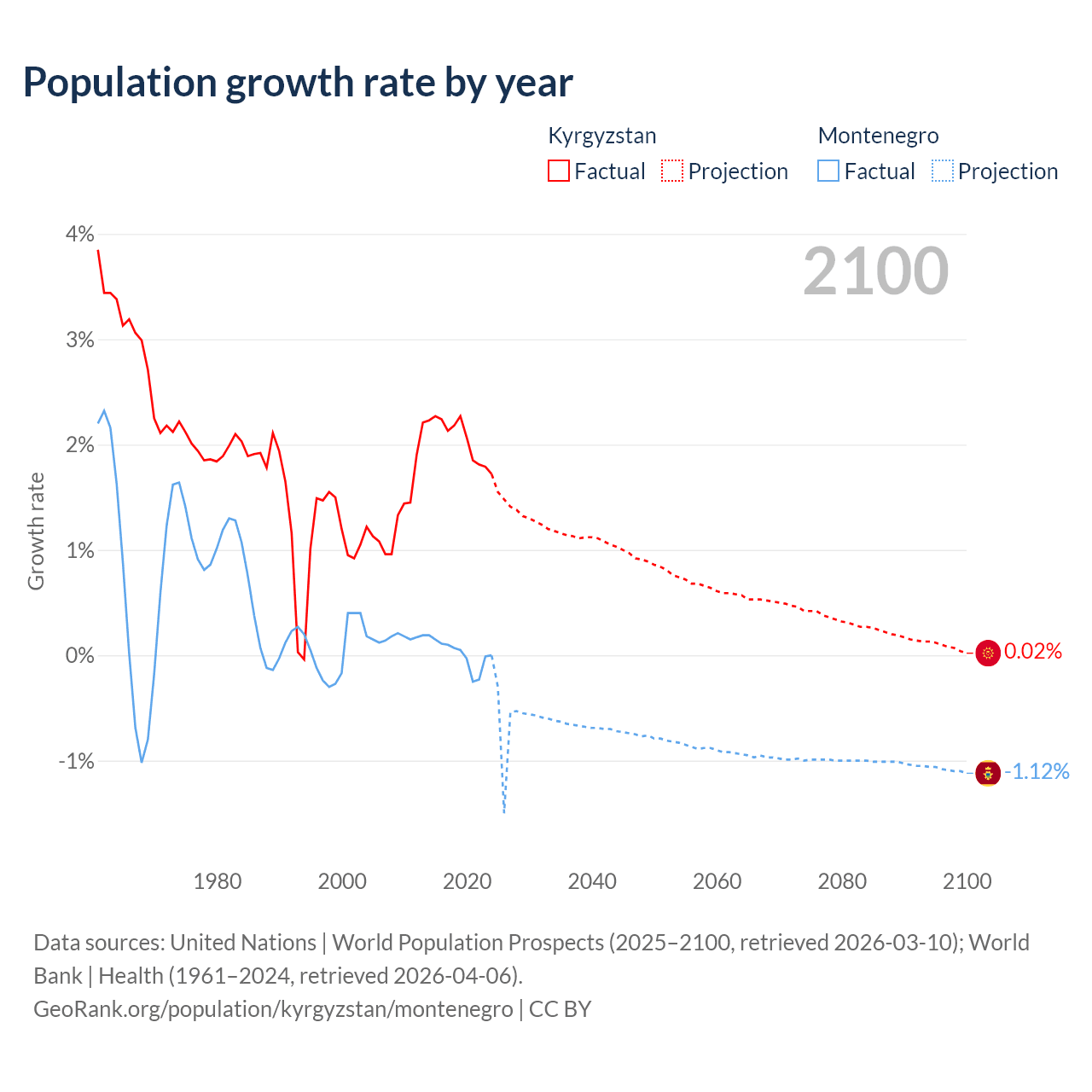 Data sources: World Bank | Health (1960–2024, retrieved 2026-04-06); United Nations | World Population Prospects (1960–2026, retrieved 2026-03-10); U.S. Census Bureau (1960–2025, retrieved 2026-02-08); Central Intelligence Agency (CIA) (2000–2019, retrieved 2026-02-20).