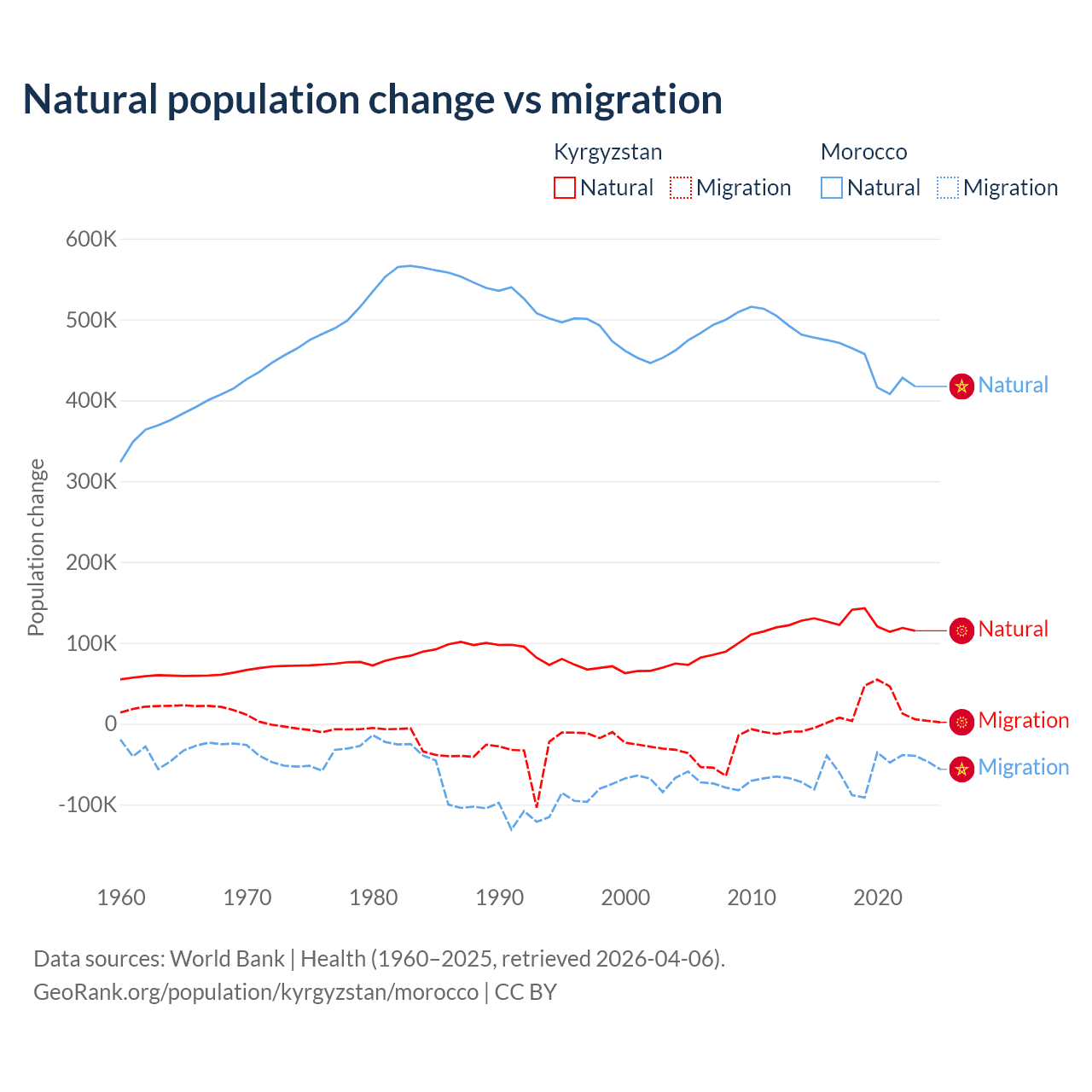 Over the last 10 years, 88.5% of the population change in Kyrgyzstan is from natural causes (a gain of 1,258,837 people) and 11.5% is from migration (a gain of 164,132 people). In Morocco 88.3% is from natural causes (a gain of 4,495,223 people) and 11.7% is from migration (a loss of 594,083 people).