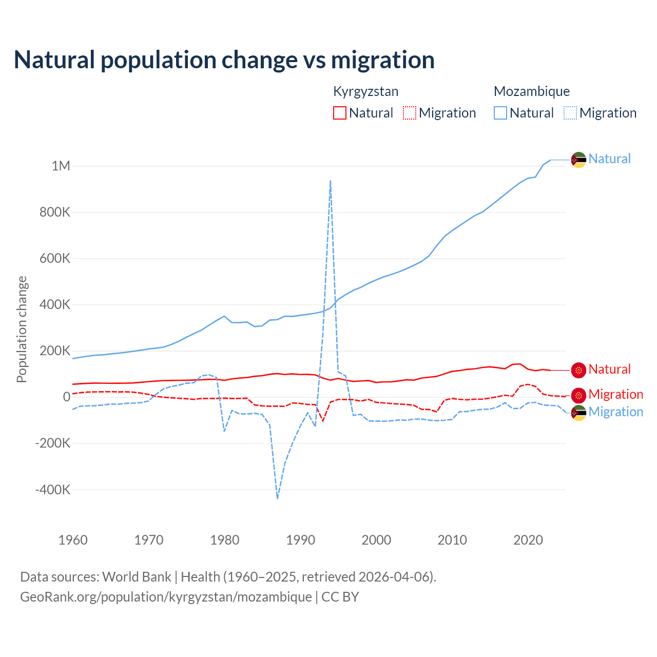 Over the last 10 years, 88.5% of the population change in Kyrgyzstan is from natural causes (a gain of 1,258,837 people) and 11.5% is from migration (a gain of 164,132 people). In Mozambique 95.9% is from natural causes (a gain of 9,108,203 people) and 4.15% is from migration (a loss of 393,923 people).