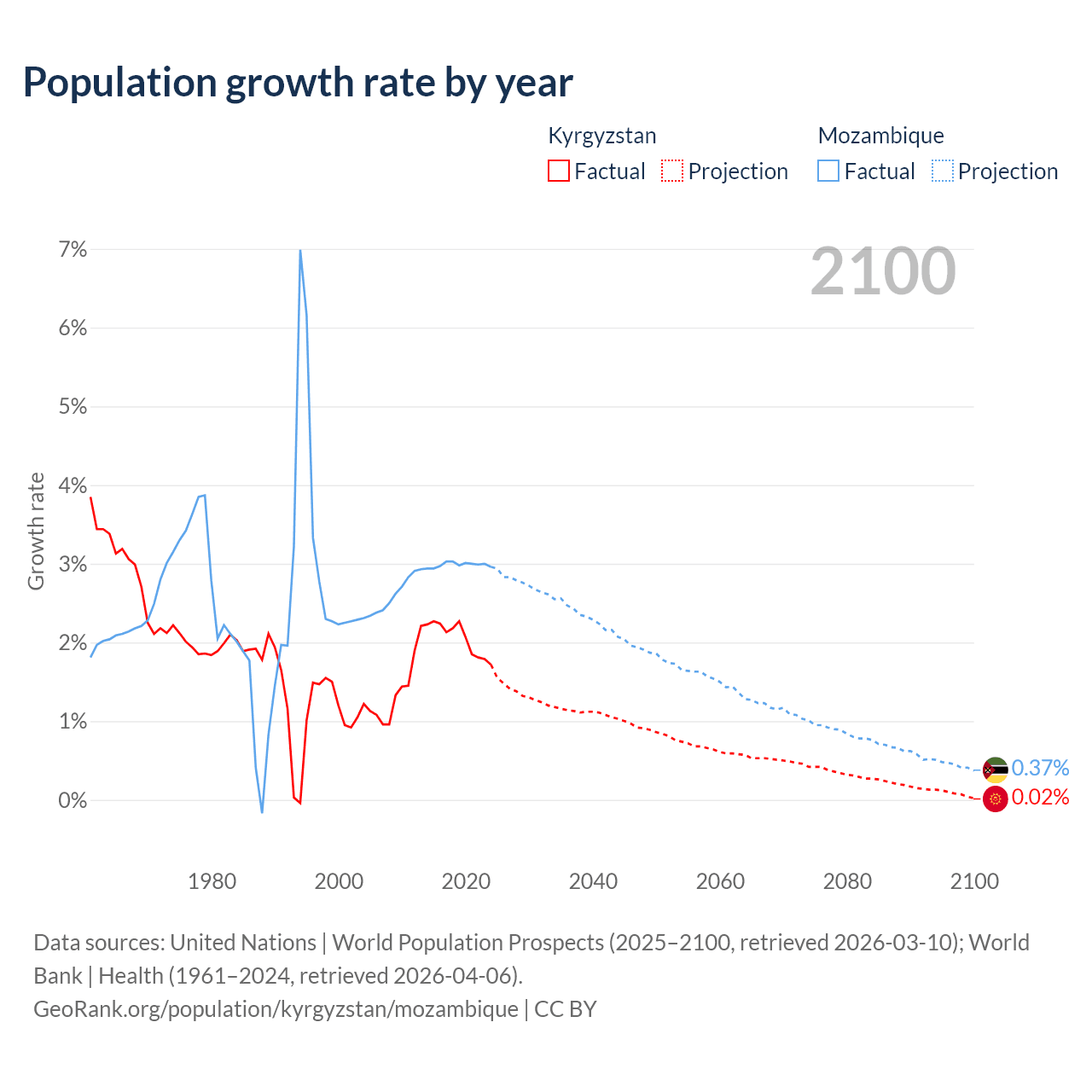 - For the last 10 years, Kyrgyzstan has had an average growth rate of +2.05% per year vs +2.99% in Mozambique.