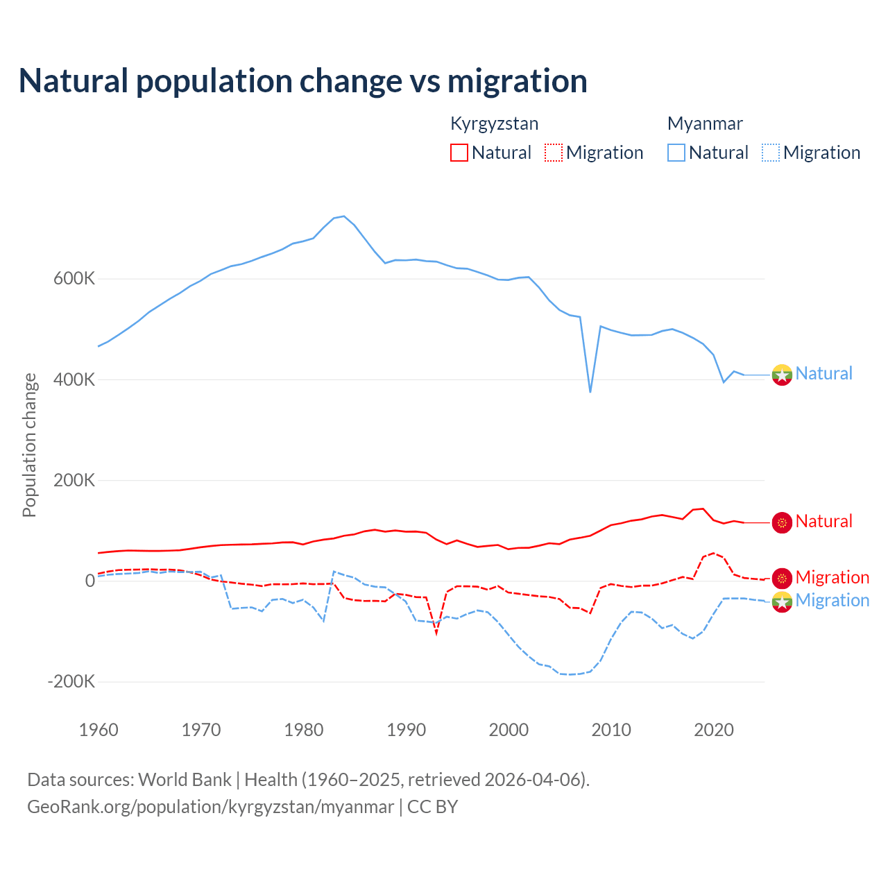 Over the last 10 years, 88.5% of the population change in Kyrgyzstan is from natural causes (a gain of 1,258,837 people) and 11.5% is from migration (a gain of 164,132 people). In Myanmar 86% is from natural causes (a gain of 4,594,615 people) and 14% is from migration (a loss of 749,272 people).