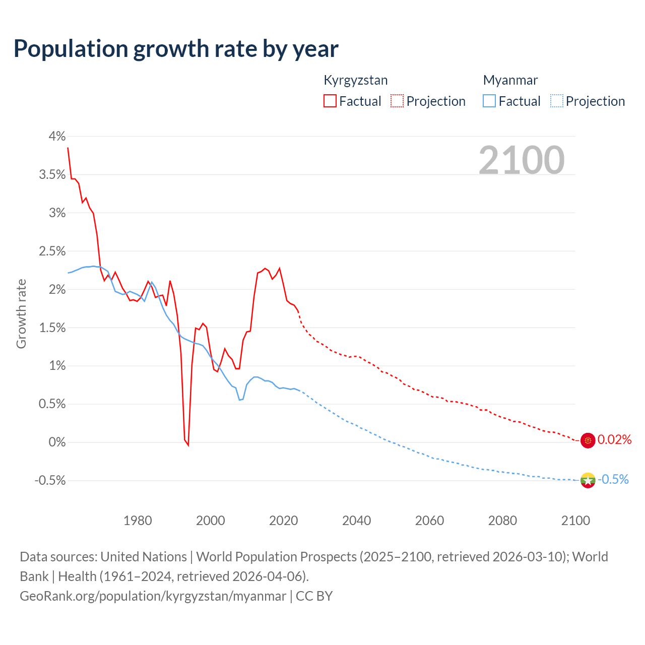 - For the last 10 years, Kyrgyzstan has had an average growth rate of +2.05% per year vs +0.74% in Myanmar.