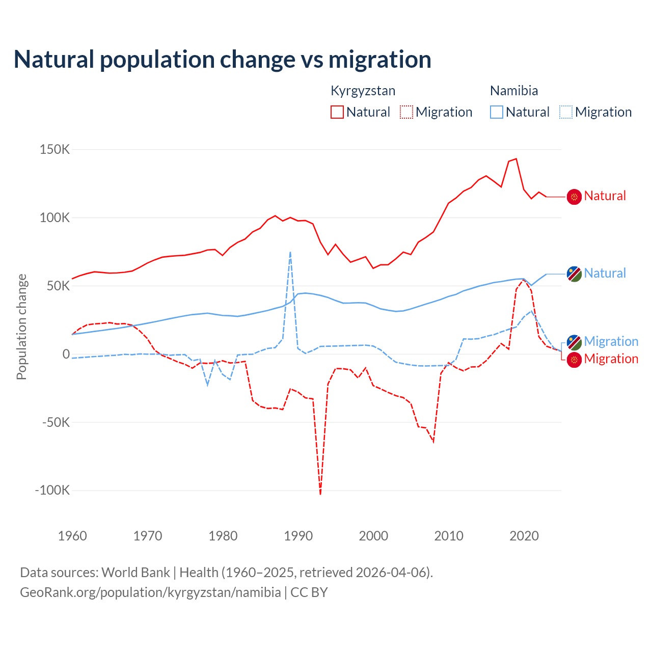 Over the last 10 years, 88.5% of the population change in Kyrgyzstan is from natural causes (a gain of 1,258,837 people) and 11.5% is from migration (a gain of 164,132 people). In Namibia 74.3% is from natural causes (a gain of 532,532 people) and 25.7% is from migration (a gain of 183,837 people).