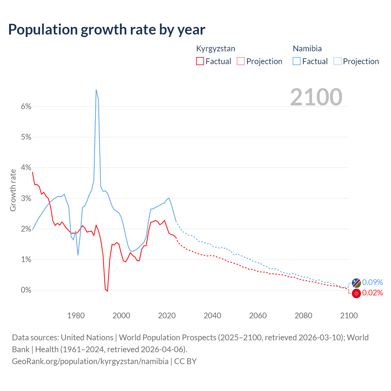 Kyrgyzstan vs Namibia: population by year and forecast