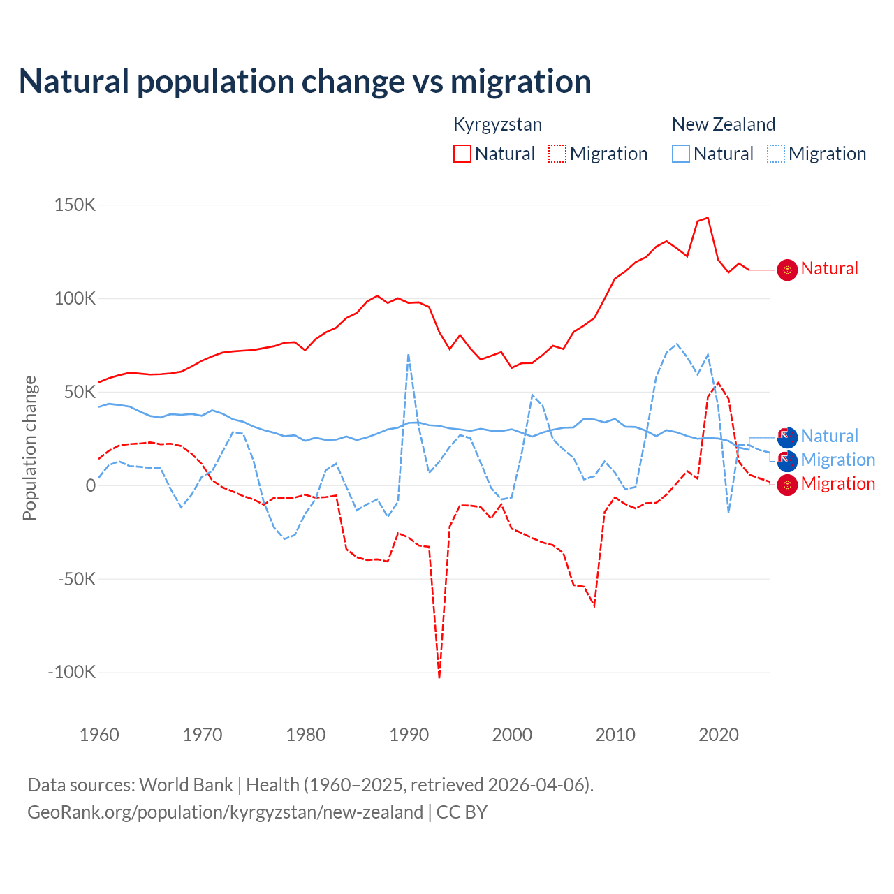 Over the last 10 years, 88.5% of the population change in Kyrgyzstan is from natural causes (a gain of 1,258,837 people) and 11.5% is from migration (a gain of 164,132 people). In New Zealand 34.4% is from natural causes (a gain of 247,767 people) and 65.6% is from migration (a gain of 471,602 people).