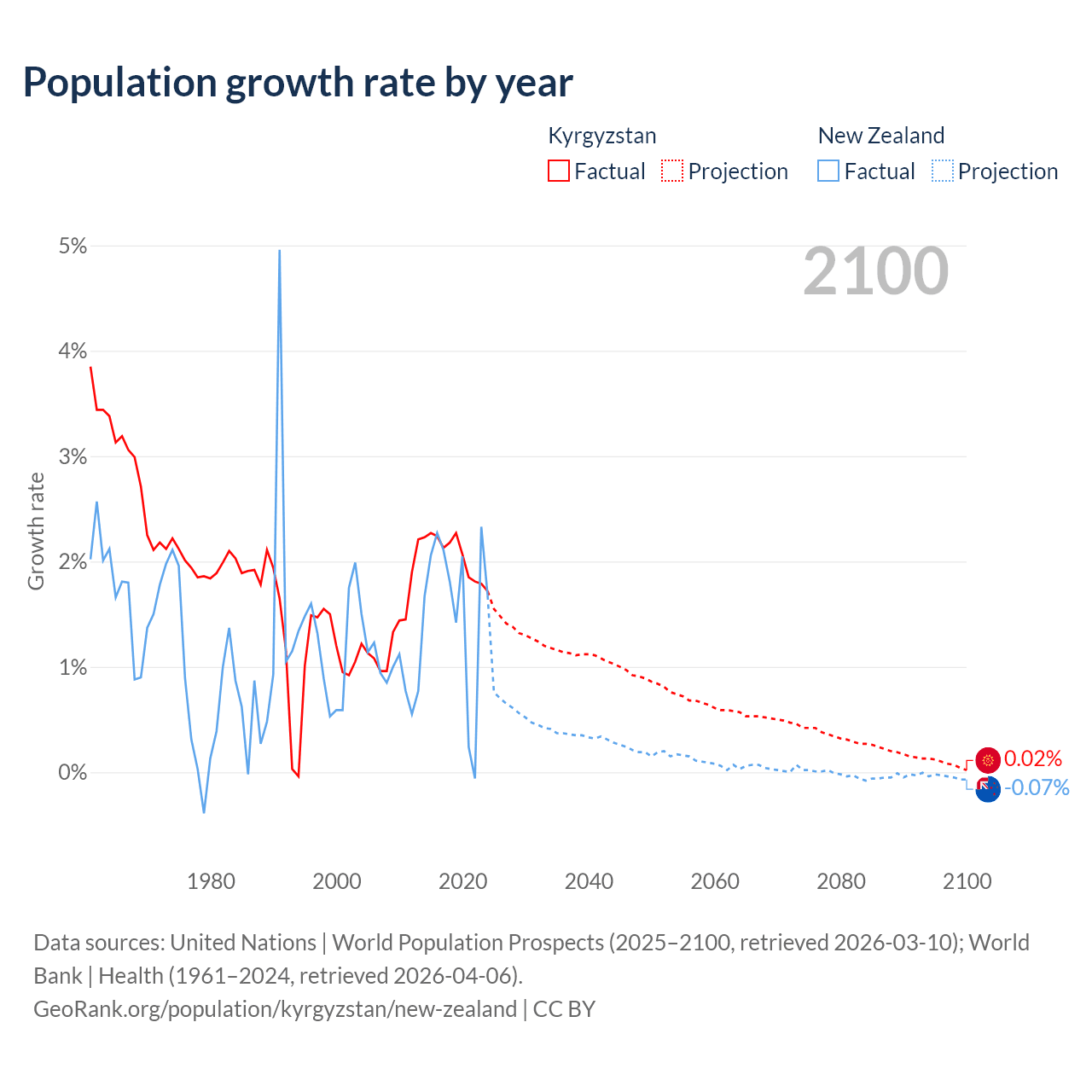 - For the last 10 years, Kyrgyzstan has had an average growth rate of +2.05% per year vs +1.6% in New Zealand.