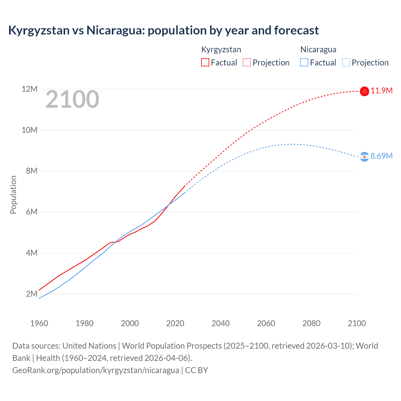 Kyrgyzstan vs Nicaragua: population by year and forecast