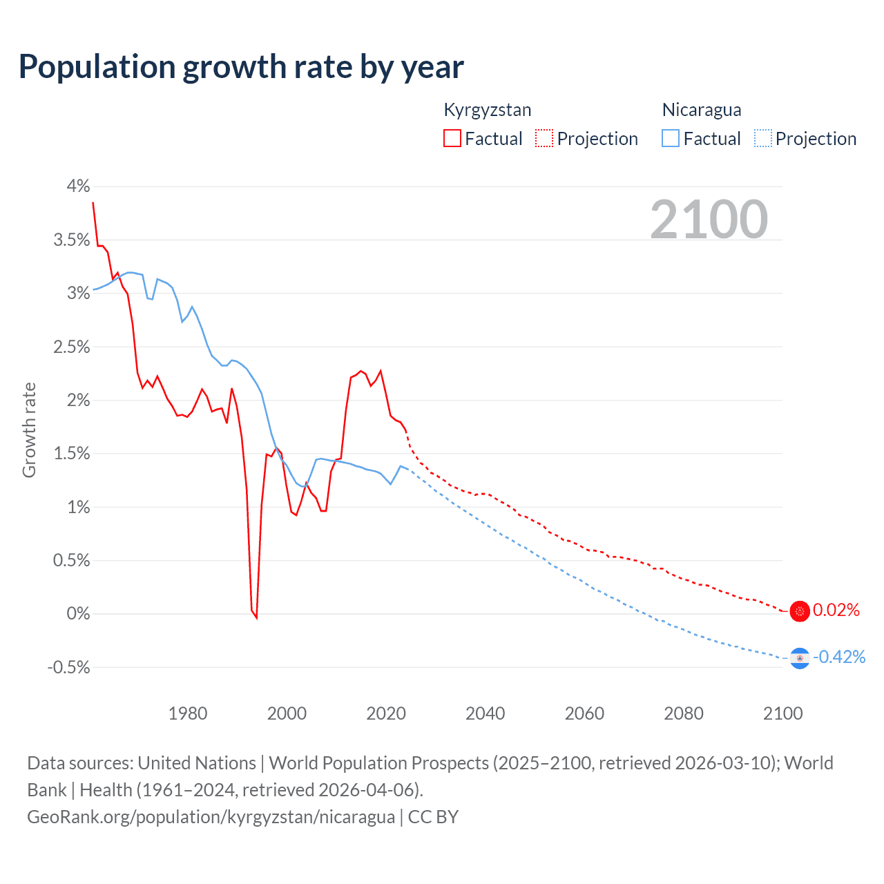 - For the last 10 years, Kyrgyzstan has had an average growth rate of +2.05% per year vs +1.33% in Nicaragua.