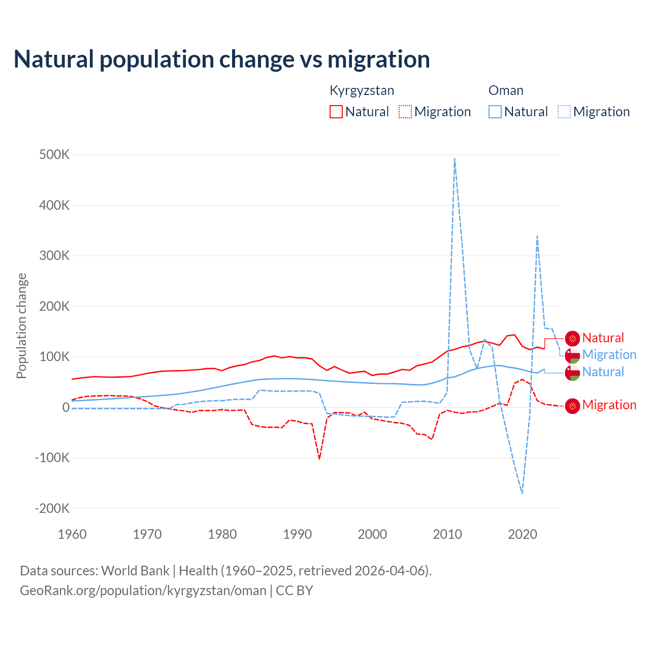 Over the last 10 years, 88.5% of the population change in Kyrgyzstan is from natural causes (a gain of 1,258,837 people) and 11.5% is from migration (a gain of 164,132 people). In Oman 61.6% is from natural causes (a gain of 763,049 people) and 38.4% is from migration (a gain of 475,565 people).
