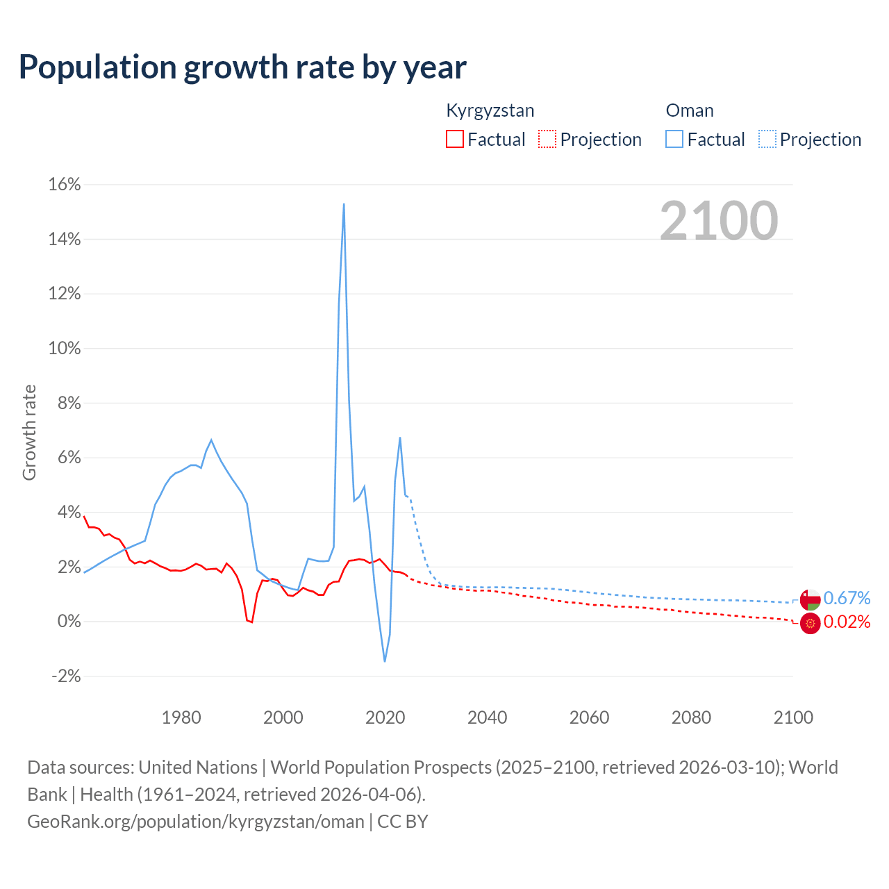 - For the last 10 years, Kyrgyzstan has had an average growth rate of +2.05% per year vs +2.99% in Oman.