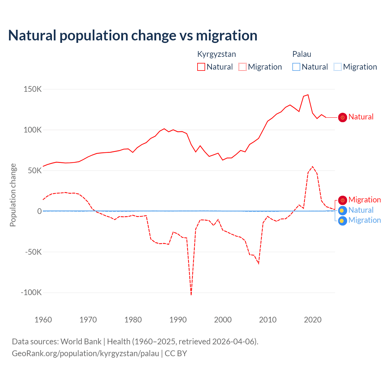 Over the last 10 years, 88.5% of the population change in Kyrgyzstan is from natural causes (a gain of 1,258,837 people) and 11.5% is from migration (a gain of 164,132 people). In Palau 53.8% is from natural causes (a gain of 264 people) and 46.2% is from migration (a loss of 227 people).