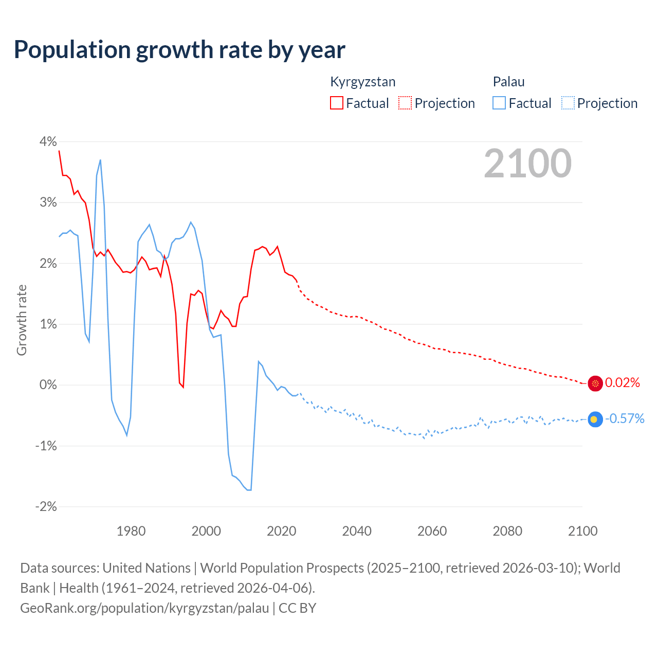 - For the last 10 years, Kyrgyzstan has had an average growth rate of +2.05% per year vs +0.02% in Palau.