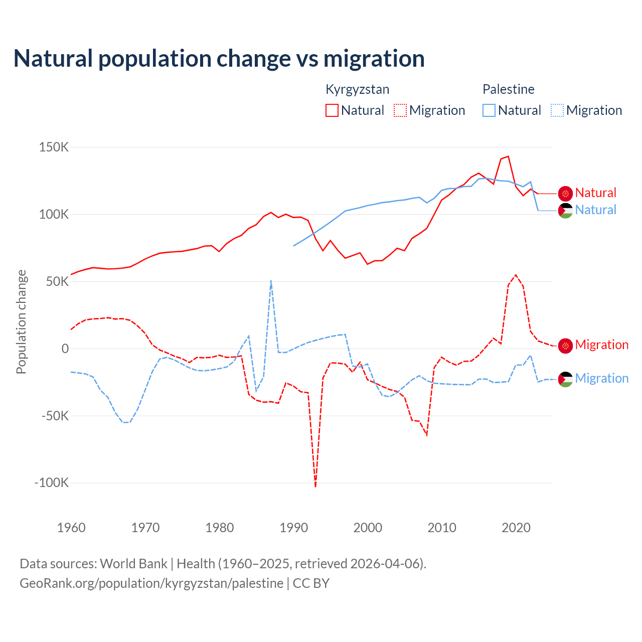Over the last 10 years, 88.5% of the population change in Kyrgyzstan is from natural causes (a gain of 1,258,837 people) and 11.5% is from migration (a gain of 164,132 people). In Palestine 85.7% is from natural causes (a gain of 1,218,010 people) and 14.3% is from migration (a loss of 202,820 people).