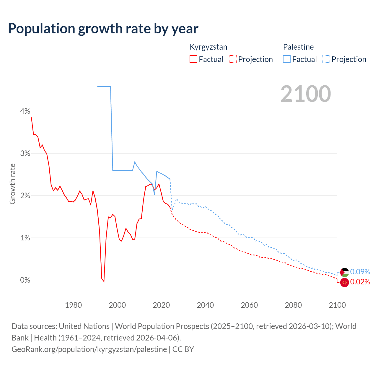- For the last 10 years, Kyrgyzstan has had an average growth rate of +2.05% per year vs +2.4% in Palestine.