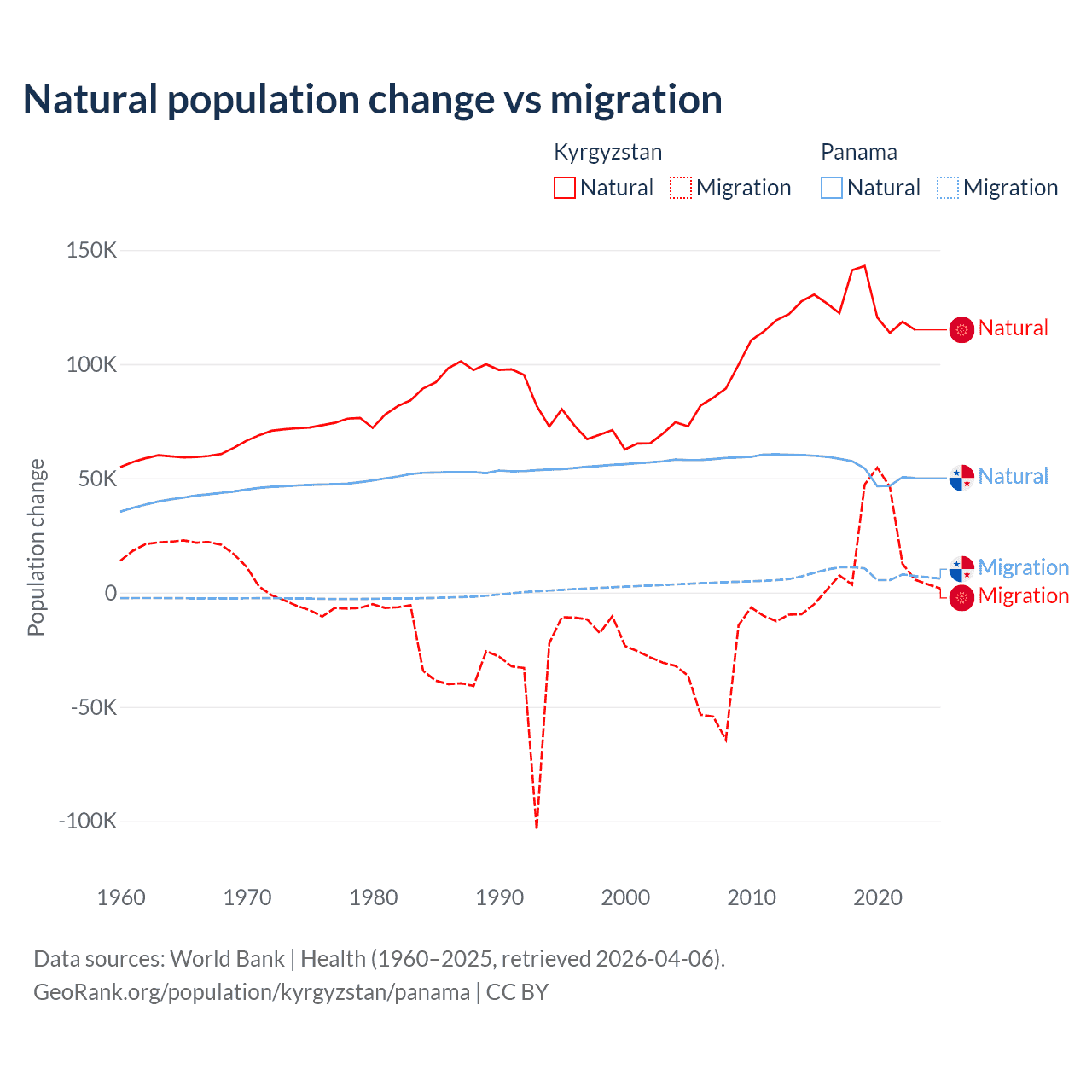 Over the last 10 years, 88.5% of the population change in Kyrgyzstan is from natural causes (a gain of 1,258,837 people) and 11.5% is from migration (a gain of 164,132 people). In Panama 86.5% is from natural causes (a gain of 544,211 people) and 13.5% is from migration (a gain of 84,849 people).