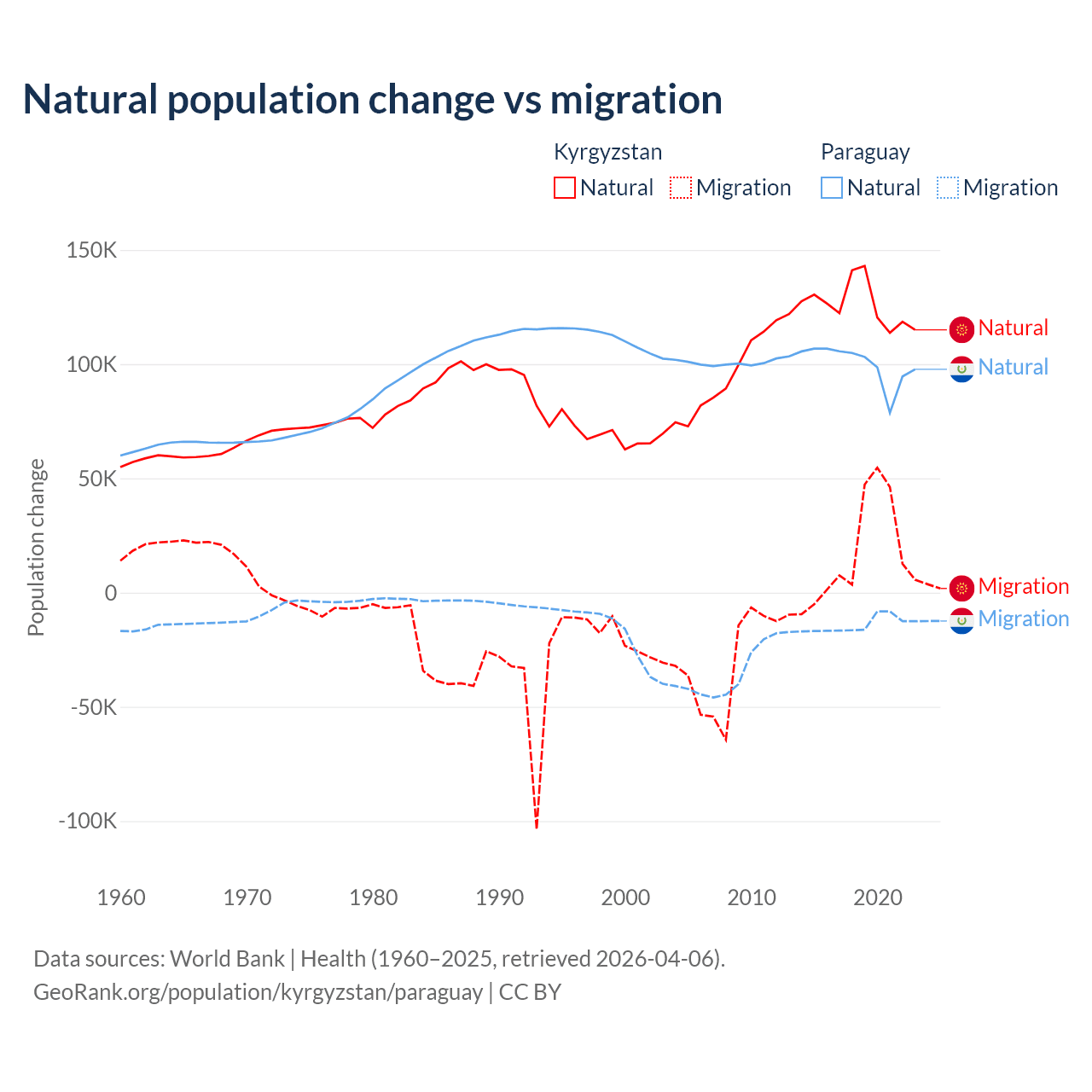 Over the last 10 years, 88.5% of the population change in Kyrgyzstan is from natural causes (a gain of 1,258,837 people) and 11.5% is from migration (a gain of 164,132 people). In Paraguay 87.6% is from natural causes (a gain of 1,002,636 people) and 12.4% is from migration (a loss of 141,377 people).