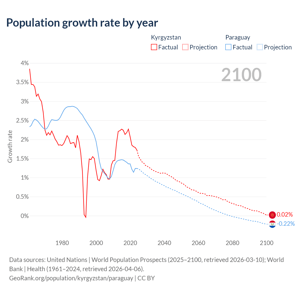- For the last 10 years, Kyrgyzstan has had an average growth rate of +2.05% per year vs +1.34% in Paraguay.