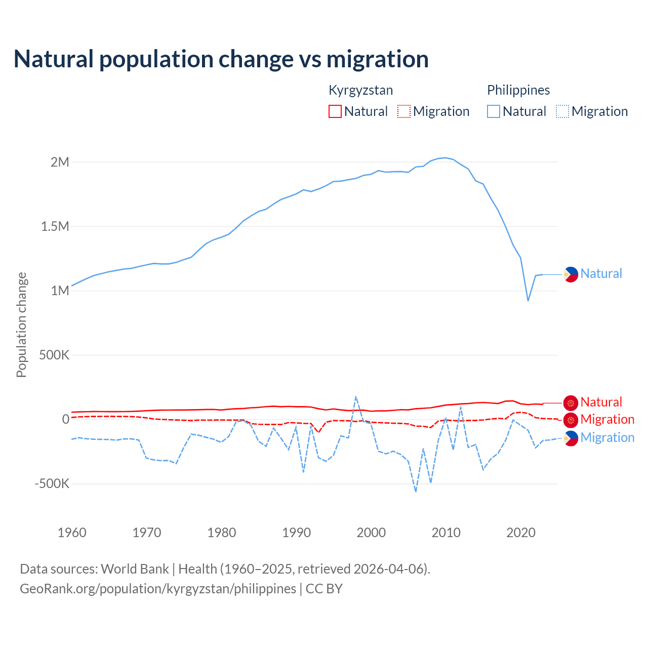 Over the last 10 years, 88.5% of the population change in Kyrgyzstan is from natural causes (a gain of 1,258,837 people) and 11.5% is from migration (a gain of 164,132 people). In the Philippines 88.5% is from natural causes (a gain of 14,279,705 people) and 11.5% is from migration (a loss of 1,848,117 people).