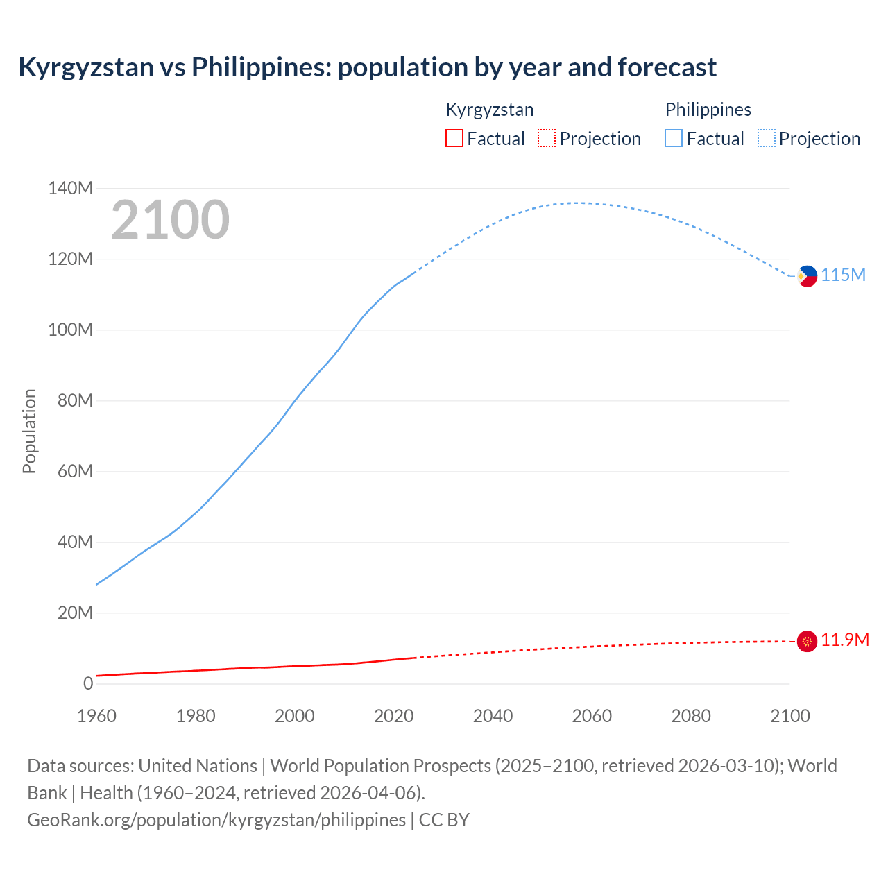 The latest officially reported population of Kyrgyzstan was 7,221,868 in 2024 vs 115,843,670 people in the Philippines in 2024. In 2026, based on the adjusted UN estimation, the current Kyrgyzstan's population is 7,471,102 people compared to 117,991,570 in the Philippines.