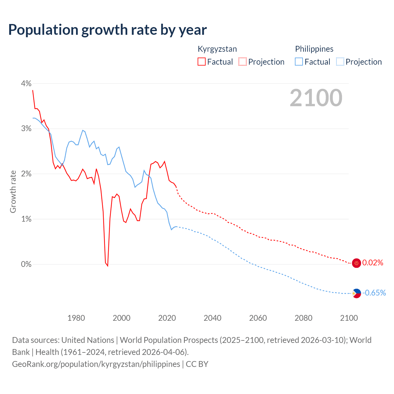 - For the last 10 years, Kyrgyzstan has had an average growth rate of +2.05% per year vs +1.16% in the Philippines.