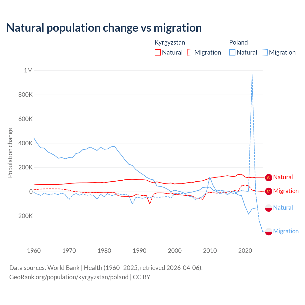Over the last 10 years, 88.5% of the population change in Kyrgyzstan is from natural causes (a gain of 1,258,837 people) and 11.5% is from migration (a gain of 164,132 people). In Poland 41.4% is from natural causes (a loss of 675,443 people) and 58.6% is from migration (a gain of 955,766 people).
