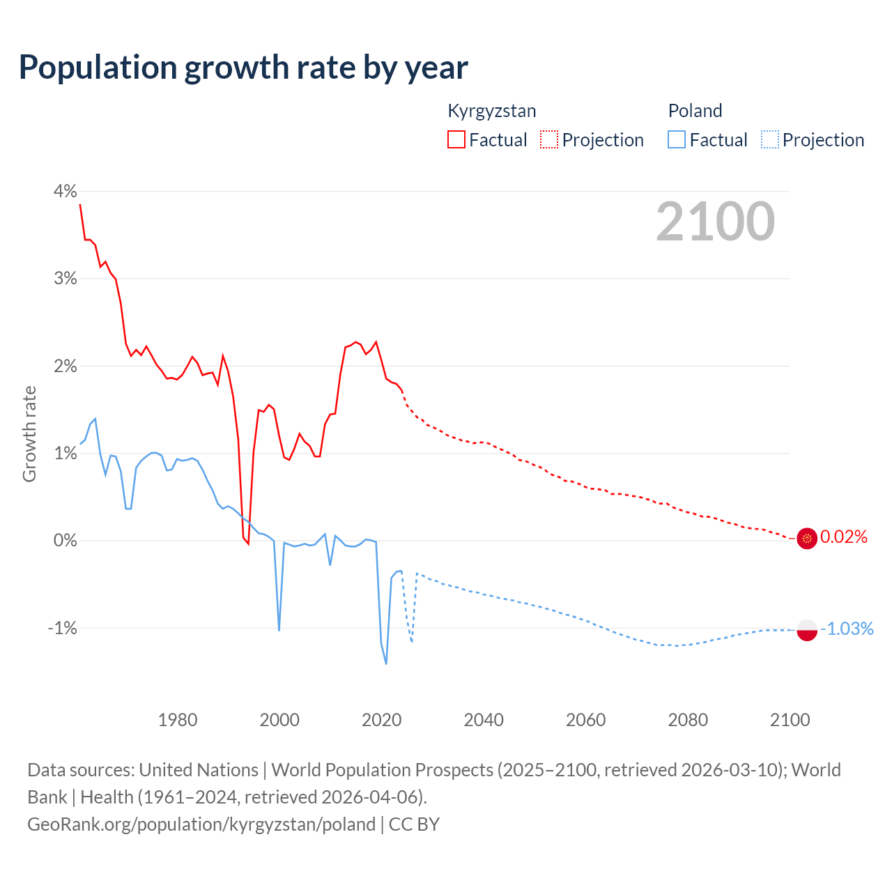 - For the last 10 years, Kyrgyzstan has had an average growth rate of +2.05% per year vs -0.36% in Poland.