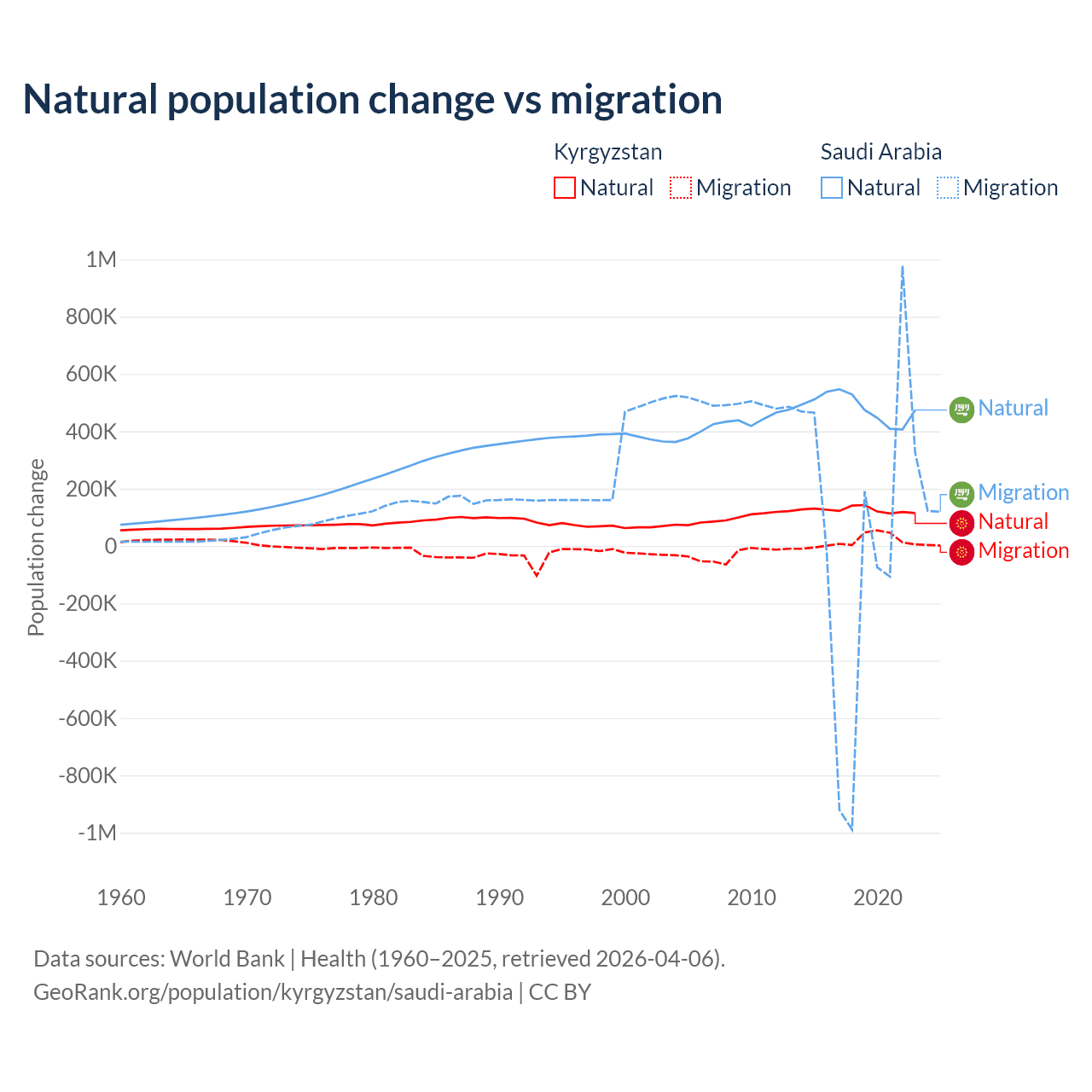 Over the last 10 years, 88.5% of the population change in Kyrgyzstan is from natural causes (a gain of 1,258,837 people) and 11.5% is from migration (a gain of 164,132 people). In Saudi Arabia 93.9% is from natural causes (a gain of 4,829,562 people) and 6.05% is from migration (a gain of 311,209 people).