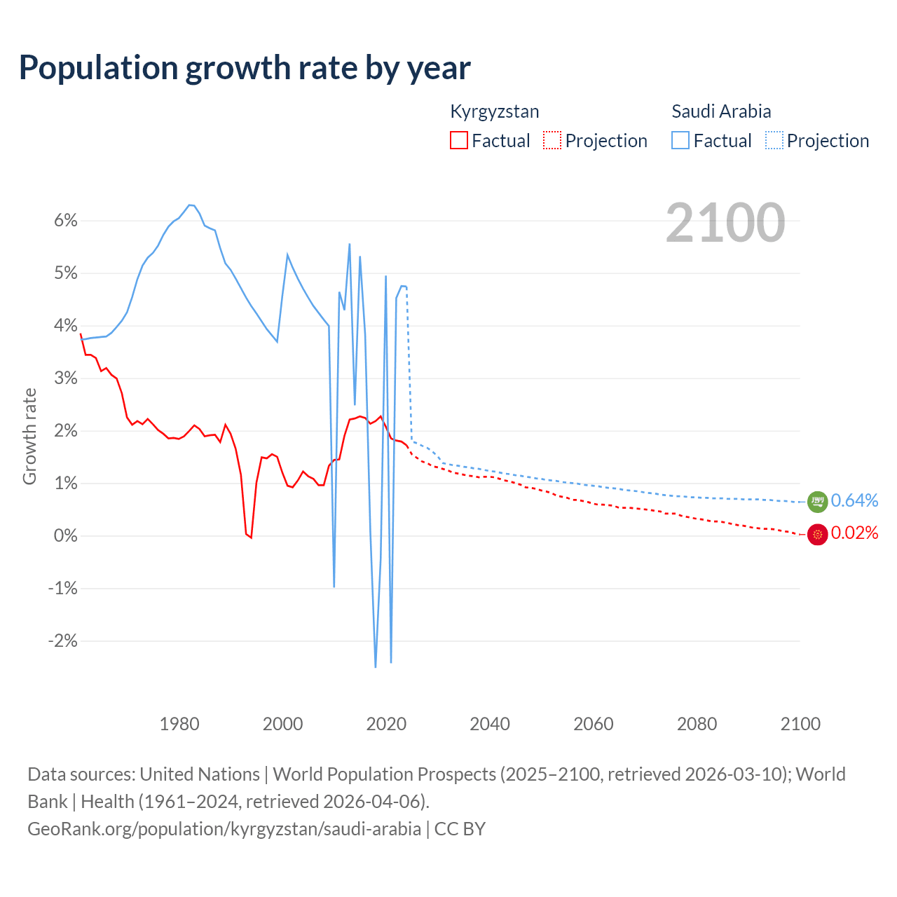 - For the last 10 years, Kyrgyzstan has had an average growth rate of +2.05% per year vs +2.3% in Saudi Arabia.