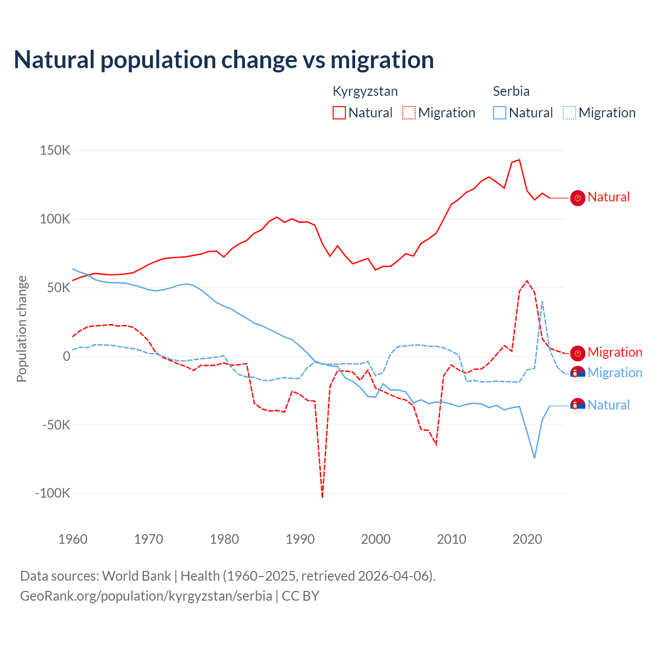 Over the last 10 years, 88.5% of the population change in Kyrgyzstan is from natural causes (a gain of 1,258,837 people) and 11.5% is from migration (a gain of 164,132 people). In Serbia 83.3% is from natural causes (a loss of 435,148 people) and 16.7% is from migration (a loss of 87,110 people).
