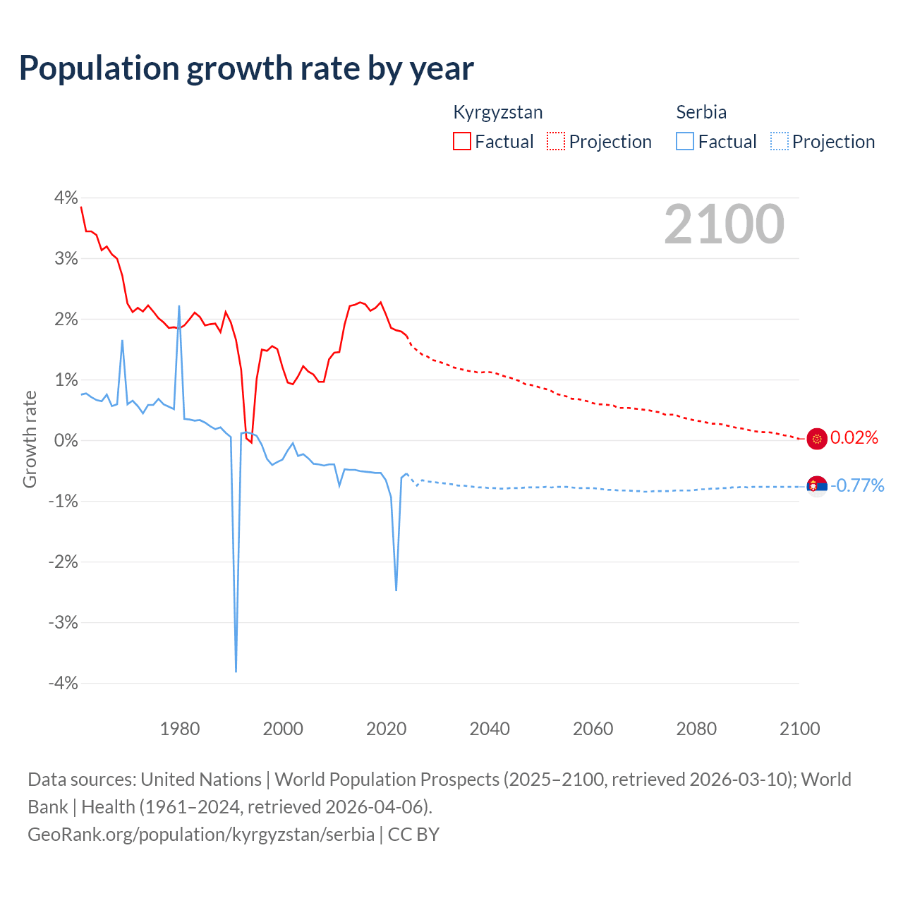 Data sources: World Bank | Health (1960–2024, retrieved 2026-04-06); United Nations | World Population Prospects (1960–2026, retrieved 2026-03-10); U.S. Census Bureau (1960–2025, retrieved 2026-02-08); Central Intelligence Agency (CIA) (2000–2019, retrieved 2026-02-20).