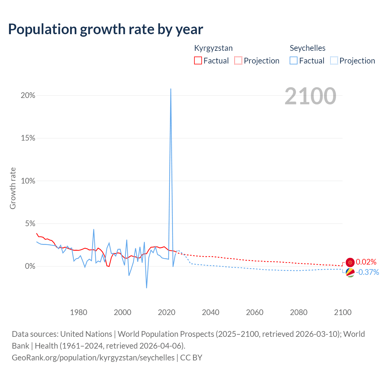 - For the last 10 years, Kyrgyzstan has had an average growth rate of +2.05% per year vs +2.9% in the Seychelles.