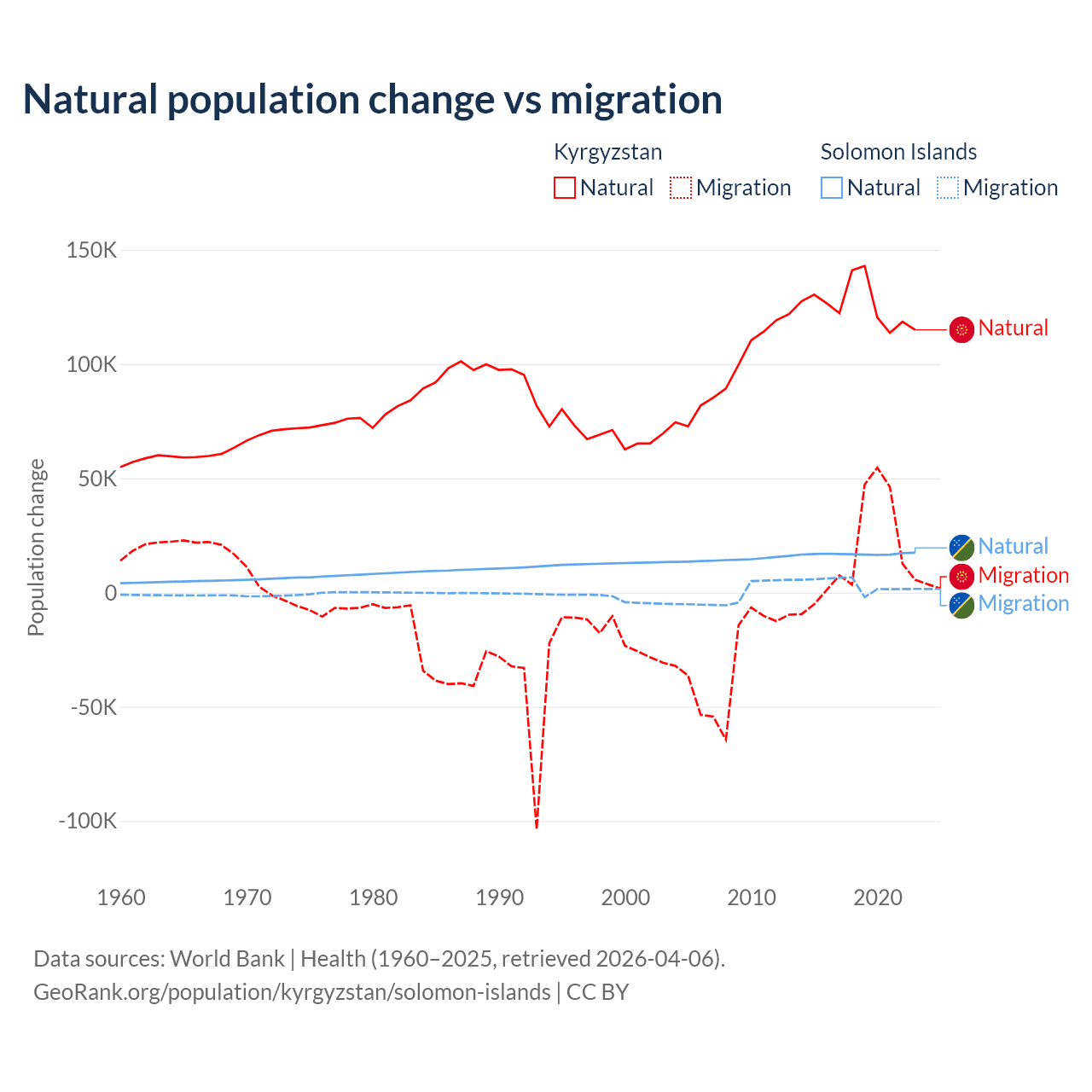 Over the last 10 years, 88.5% of the population change in Kyrgyzstan is from natural causes (a gain of 1,258,837 people) and 11.5% is from migration (a gain of 164,132 people). In the Solomon Islands 82.8% is from natural causes (a gain of 168,727 people) and 17.2% is from migration (a gain of 35,031 people).