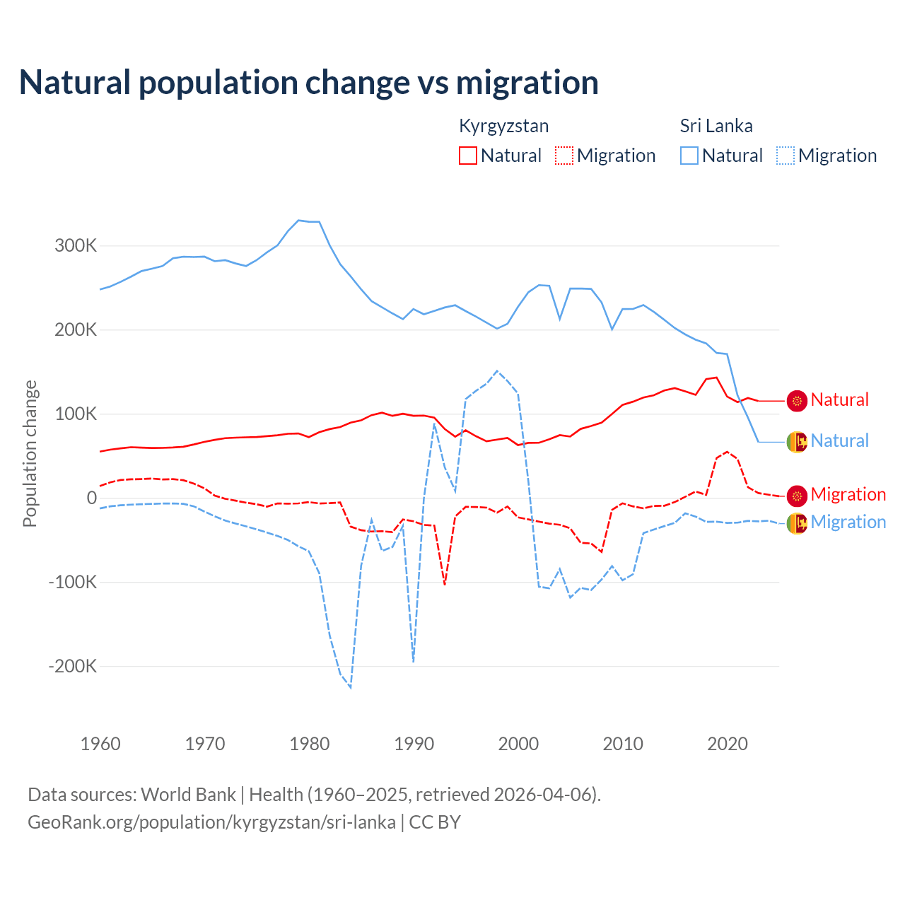 Over the last 10 years, 88.5% of the population change in Kyrgyzstan is from natural causes (a gain of 1,258,837 people) and 11.5% is from migration (a gain of 164,132 people). In Sri Lanka 85.3% is from natural causes (a gain of 1,605,749 people) and 14.7% is from migration (a loss of 276,121 people).