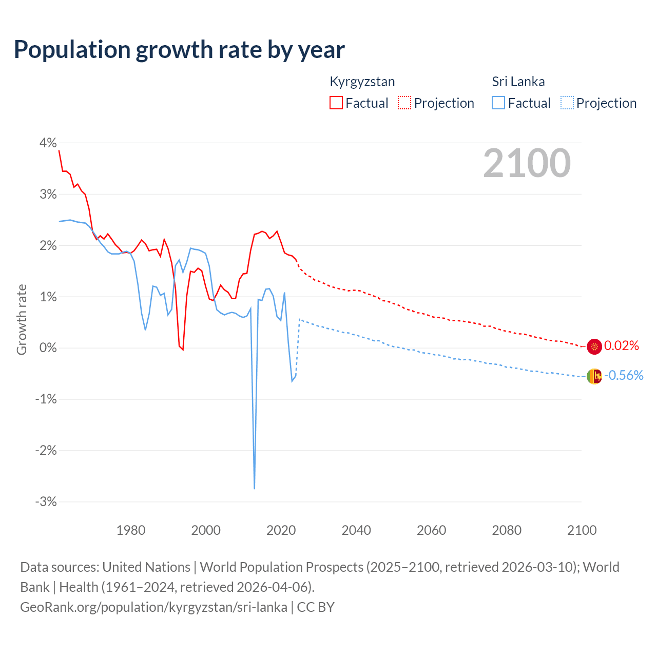 - For the last 10 years, Kyrgyzstan has had an average growth rate of +2.05% per year vs +0.57% in Sri Lanka.