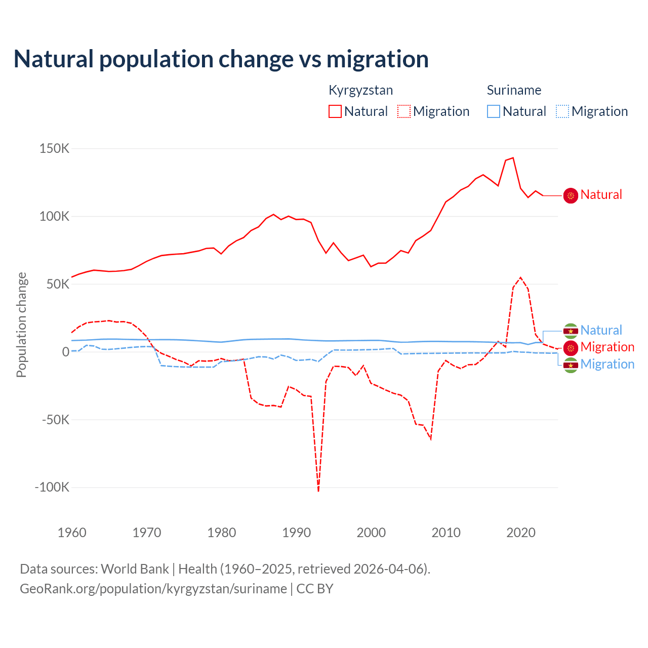 Over the last 10 years, 88.5% of the population change in Kyrgyzstan is from natural causes (a gain of 1,258,837 people) and 11.5% is from migration (a gain of 164,132 people). In Suriname 90.3% is from natural causes (a gain of 66,709 people) and 9.72% is from migration (a loss of 7,185 people).