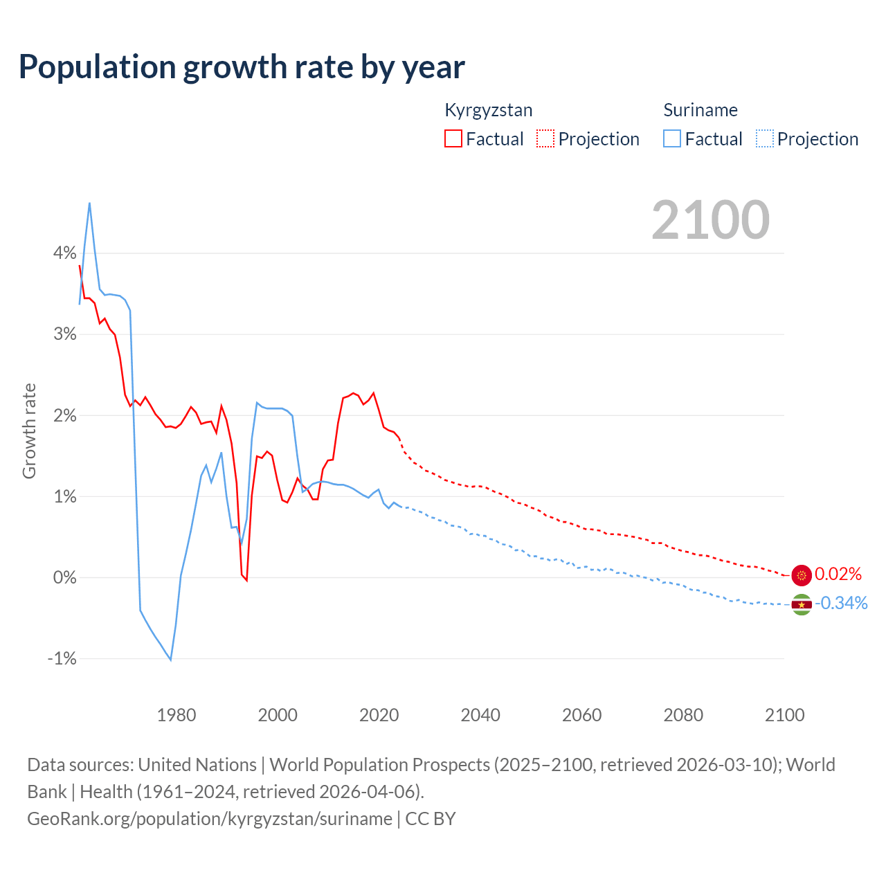 Data sources: World Bank | Health (1960–2024, retrieved 2026-04-06); United Nations | World Population Prospects (1960–2026, retrieved 2026-03-10); U.S. Census Bureau (1960–2025, retrieved 2026-02-08); Central Intelligence Agency (CIA) (2000–2019, retrieved 2026-02-20).