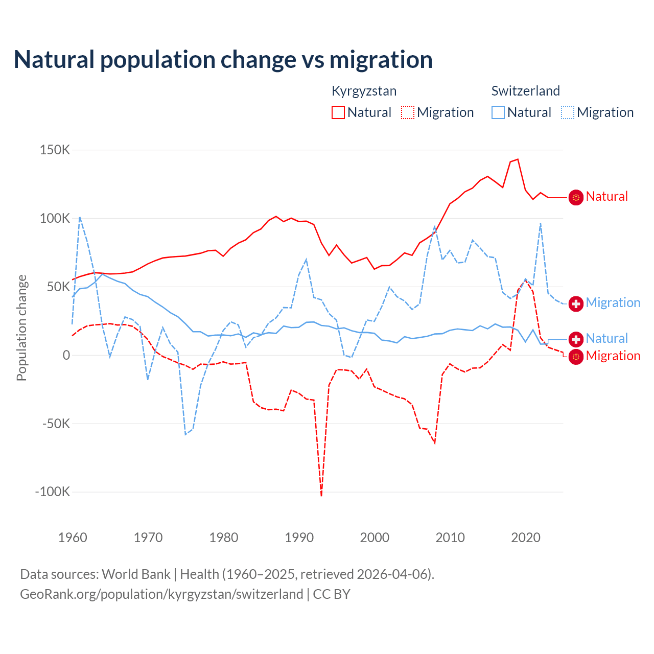 Over the last 10 years, 88.5% of the population change in Kyrgyzstan is from natural causes (a gain of 1,258,837 people) and 11.5% is from migration (a gain of 164,132 people). In Switzerland 21.6% is from natural causes (a gain of 165,354 people) and 78.4% is from migration (a gain of 600,145 people).