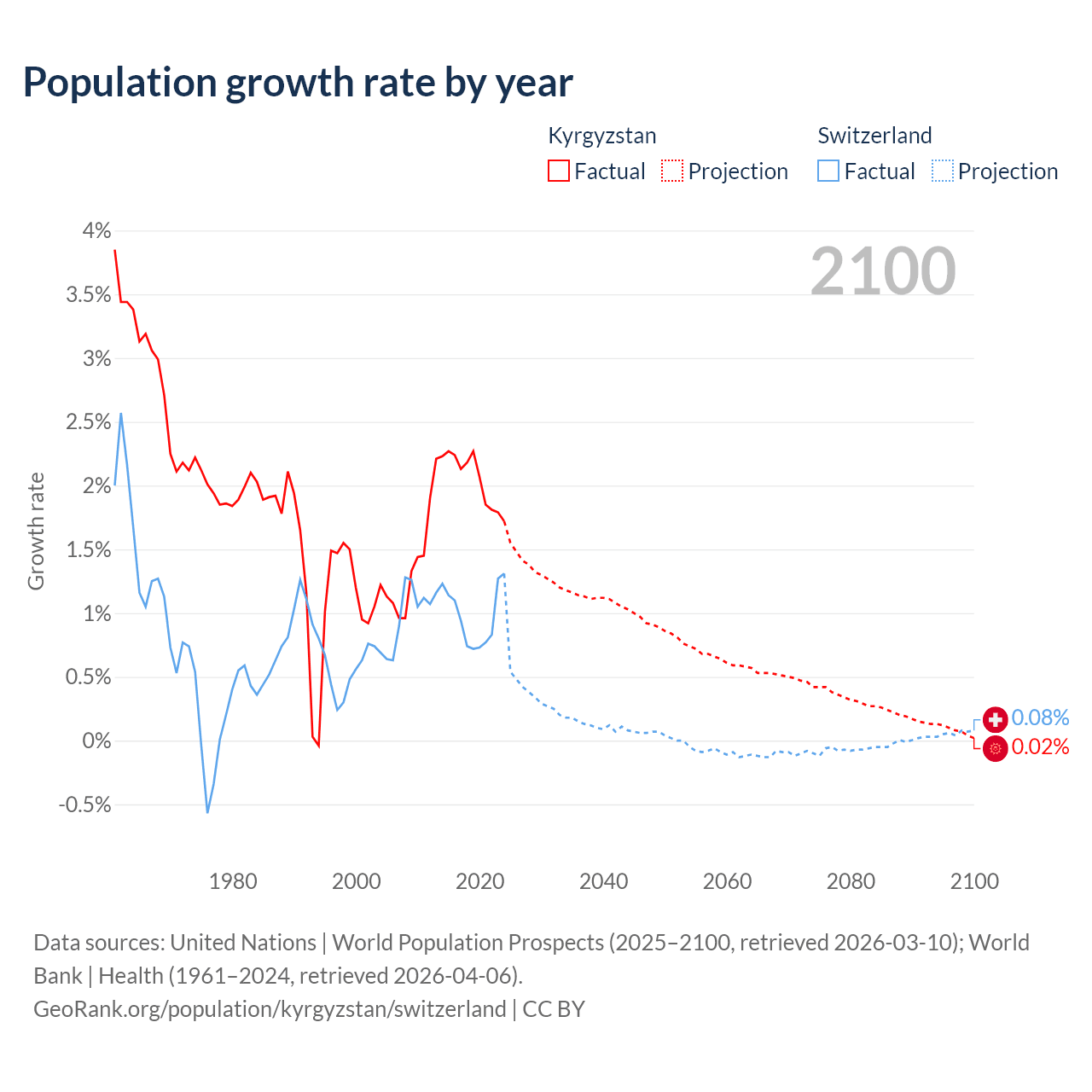 - For the last 10 years, Kyrgyzstan has had an average growth rate of +2.05% per year vs +0.98% in Switzerland.