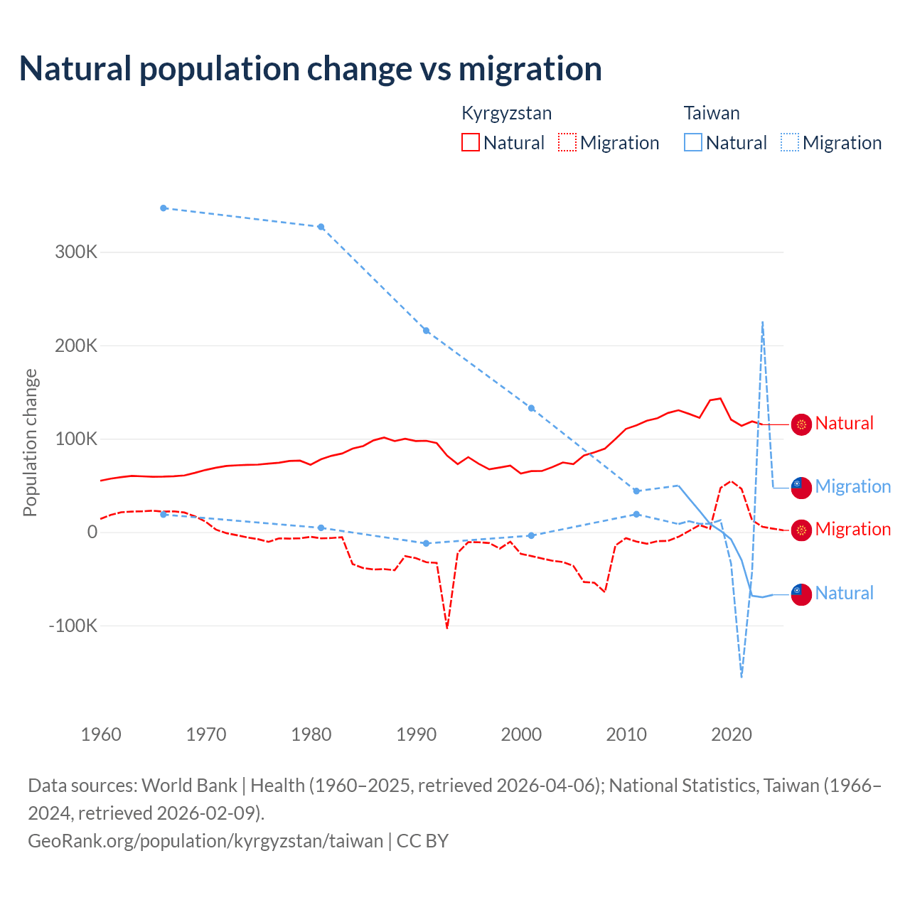 Over the last 10 years, 88.5% of the population change in Kyrgyzstan is from natural causes (a gain of 1,258,837 people) and 11.5% is from migration (a gain of 164,132 people). In Taiwan 56.7% is from natural causes (a loss of 57,467 people) and 43.3% is from migration (a gain of 43,884 people).