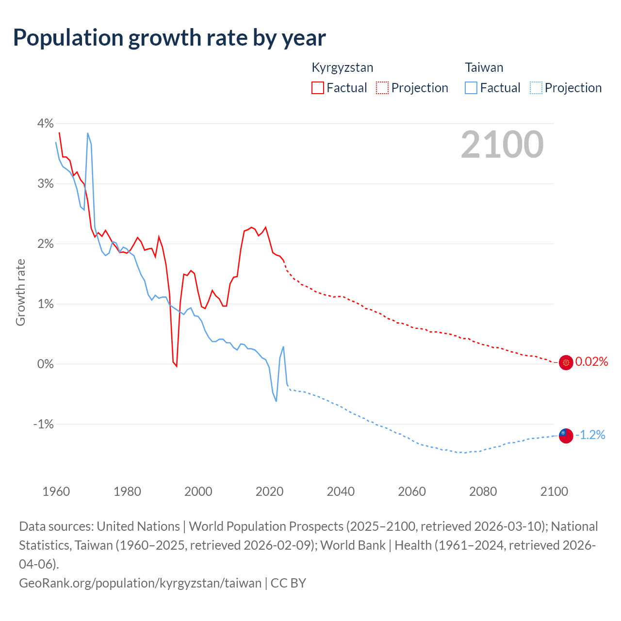 Data sources: World Bank | Health (1960–2024, retrieved 2026-04-06); United Nations | World Population Prospects (1960–2026, retrieved 2026-03-10); U.S. Census Bureau (1960–2025, retrieved 2026-02-08); National Statistics, Taiwan (1960–2025, retrieved 2026-02-09); Central Intelligence Agency (CIA) (2000–2019, retrieved 2026-02-20).