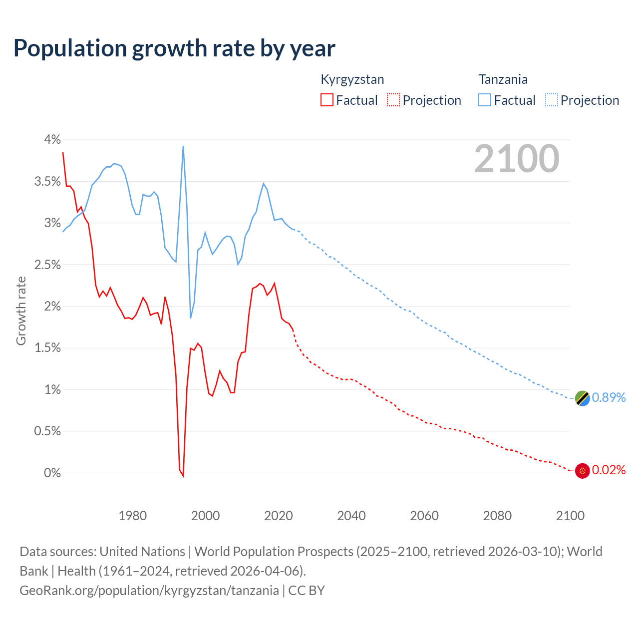 - For the last 10 years, Kyrgyzstan has had an average growth rate of +2.05% per year vs +3.13% in Tanzania.