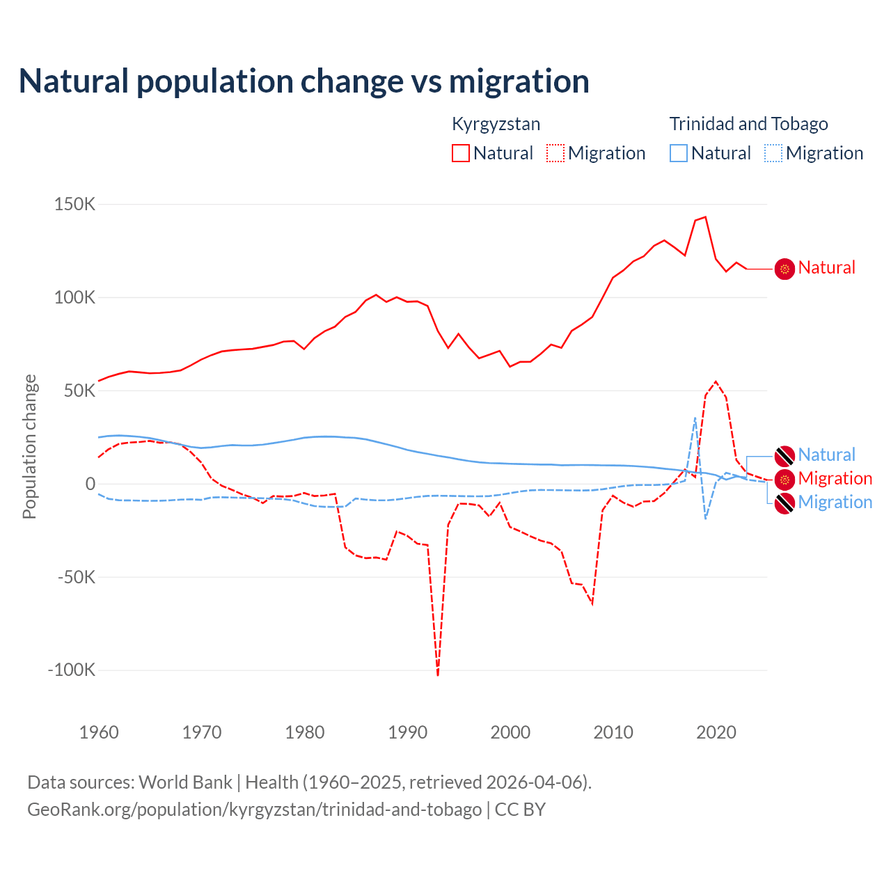 Over the last 10 years, 88.5% of the population change in Kyrgyzstan is from natural causes (a gain of 1,258,837 people) and 11.5% is from migration (a gain of 164,132 people). In Trinidad and Tobago 66% is from natural causes (a gain of 55,887 people) and 34% is from migration (a gain of 28,785 people).