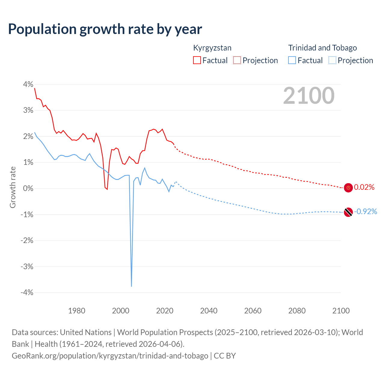 - For the last 10 years, Kyrgyzstan has had an average growth rate of +2.05% per year vs +0.19% in Trinidad and Tobago.