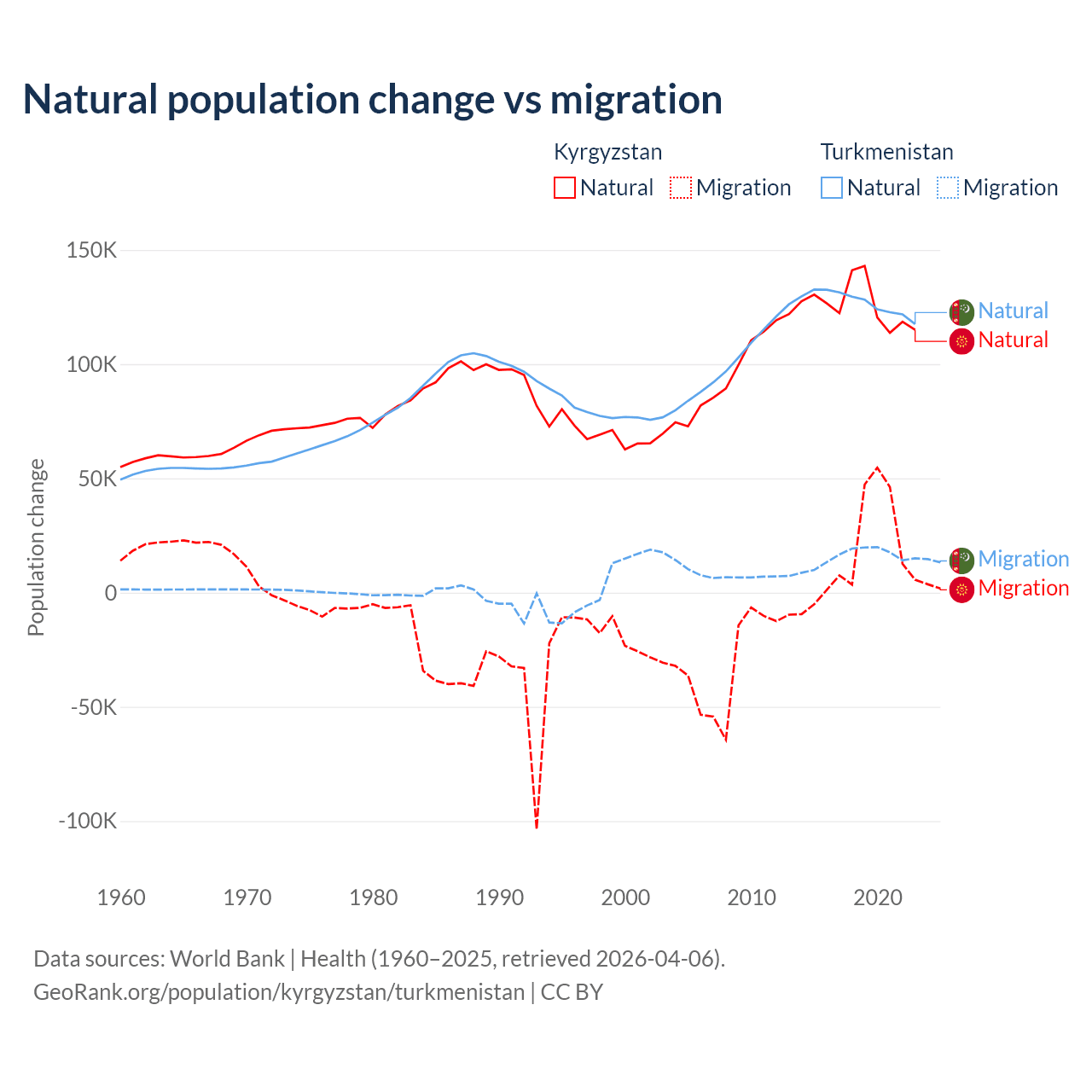 Over the last 10 years, 88.5% of the population change in Kyrgyzstan is from natural causes (a gain of 1,258,837 people) and 11.5% is from migration (a gain of 164,132 people). In Turkmenistan 89.2% is from natural causes (a gain of 1,270,228 people) and 10.8% is from migration (a gain of 154,379 people).