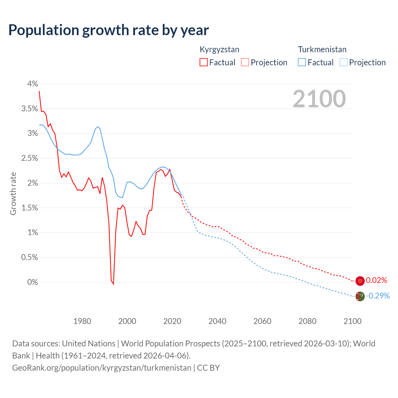 - For the last 10 years, Kyrgyzstan has had an average growth rate of +2.05% per year vs +2.14% in Turkmenistan.