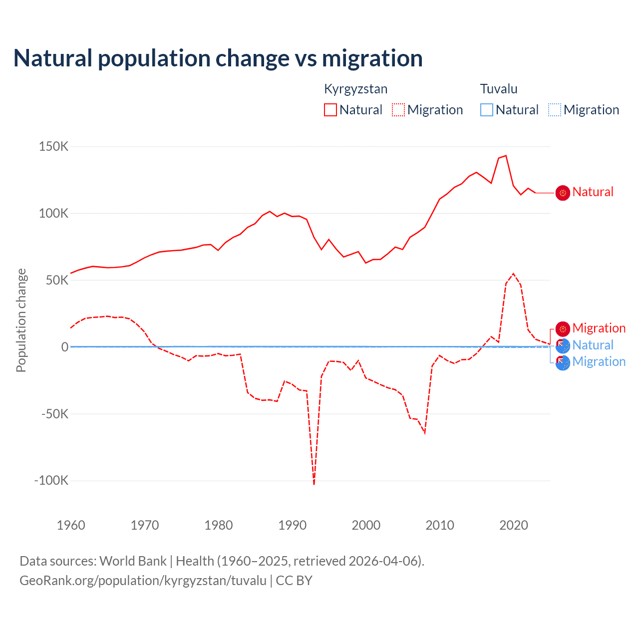 Over the last 10 years, 88.5% of the population change in Kyrgyzstan is from natural causes (a gain of 1,258,837 people) and 11.5% is from migration (a gain of 164,132 people). In Tuvalu 35.5% is from natural causes (a gain of 1,556 people) and 64.5% is from migration (a loss of 2,827 people).