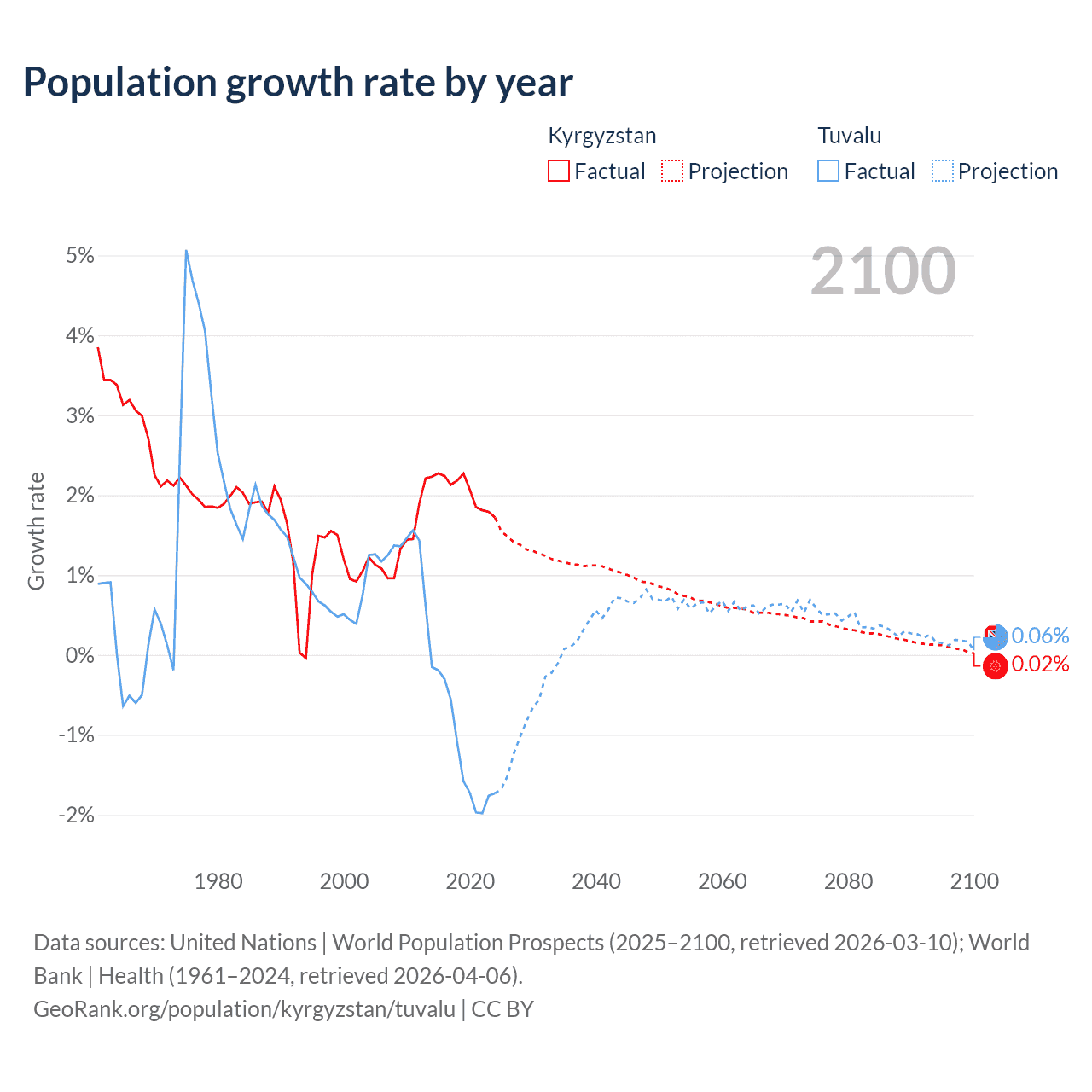 - For the last 10 years, Kyrgyzstan has had an average growth rate of +2.05% per year vs -1.19% in Tuvalu.