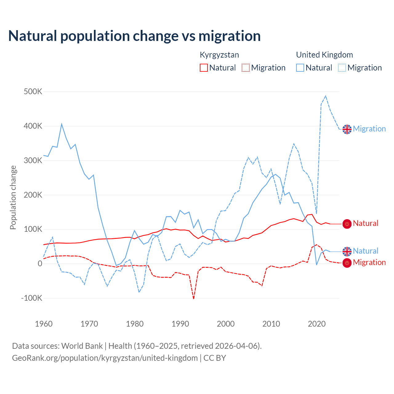Over the last 10 years, 88.5% of the population change in Kyrgyzstan is from natural causes (a gain of 1,258,837 people) and 11.5% is from migration (a gain of 164,132 people). In the United Kingdom 23.9% is from natural causes (a gain of 1,033,129 people) and 76.1% is from migration (a gain of 3,283,101 people).