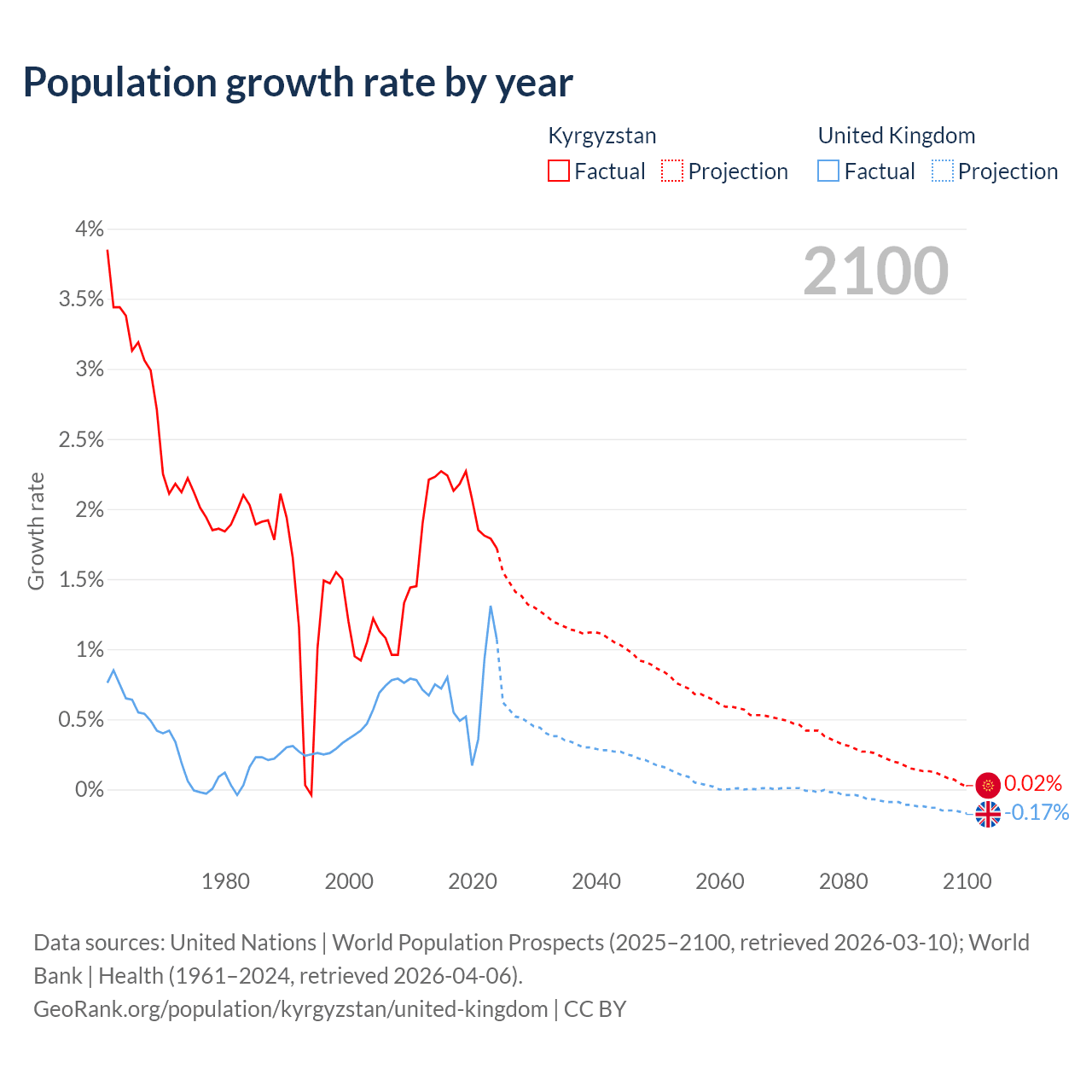 - For the last 10 years, Kyrgyzstan has had an average growth rate of +2.05% per year vs +0.7% in the United Kingdom.